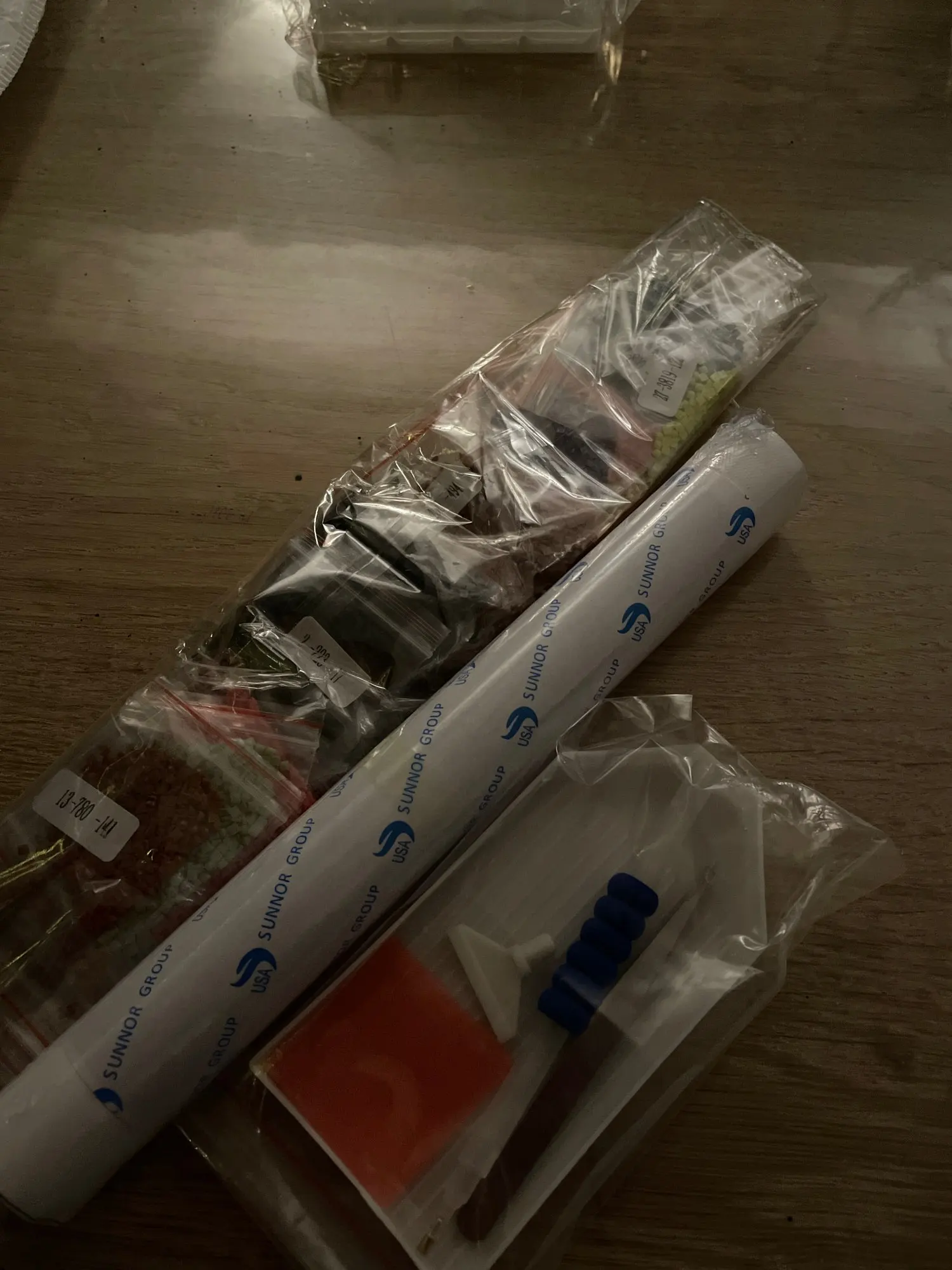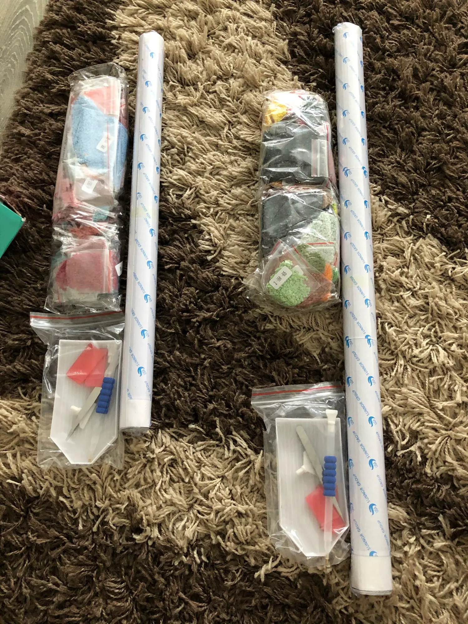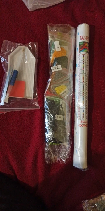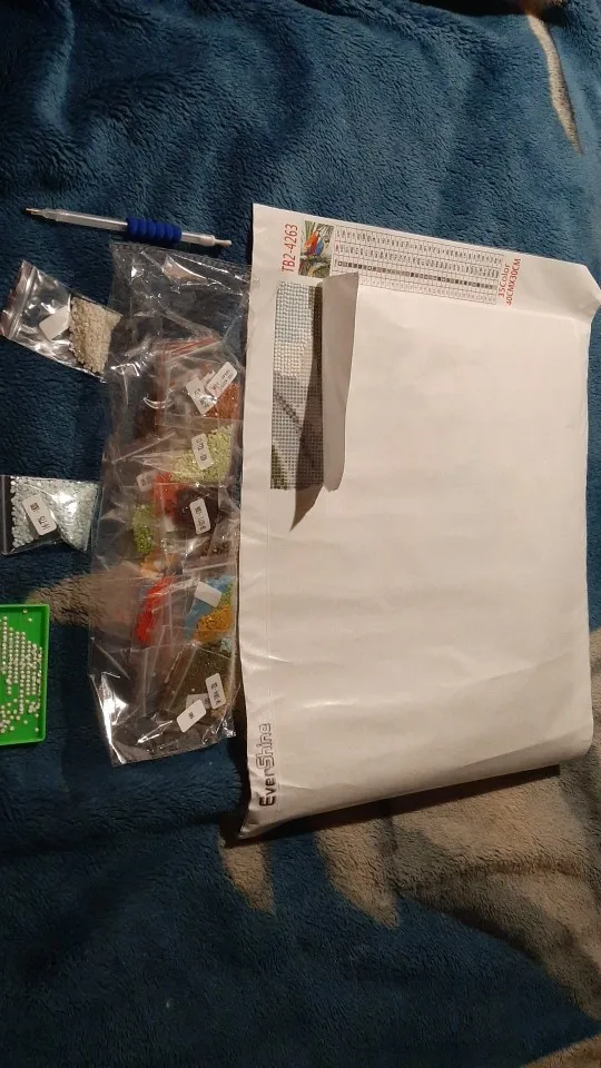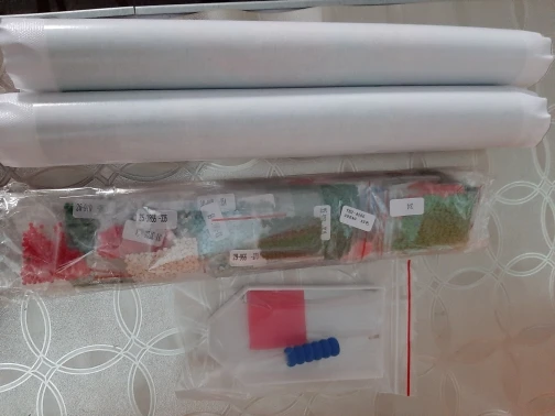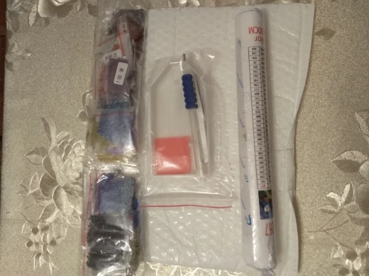 Заказ пришёл быстро, упакован в пупырку, думала будет в коробке, брала для подарка. Картина в рулоне+ стразы в мешочках+ приспособления, все целое.