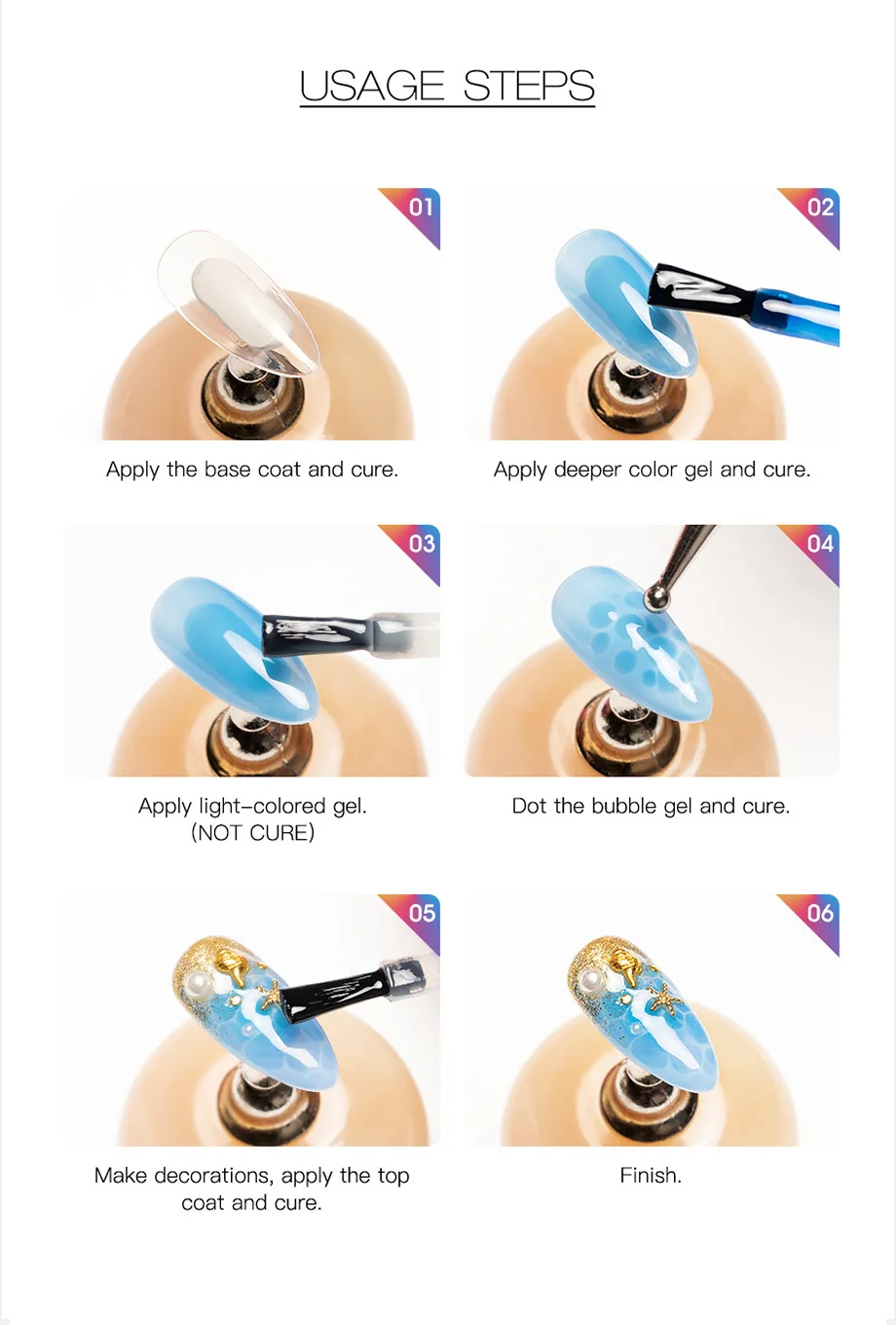 1. Нанесите базовый слой и закрепите.2. Нанесите более глубокий цветной гель и вылечите.3. Нанесите светильник цветным гелем. (Не лечение)4. Нанесите пузырьковый гель на точку и вылечите.5. Сделайте украшения, нанесите верхнее пальто и закрепите. Закончите.