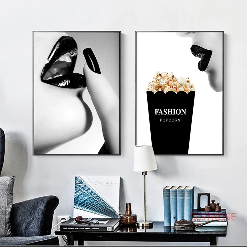 Черный и белый Модная девушка скандинавский плакат губы стены искусства холст картина Современная...