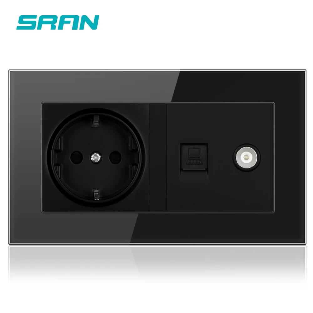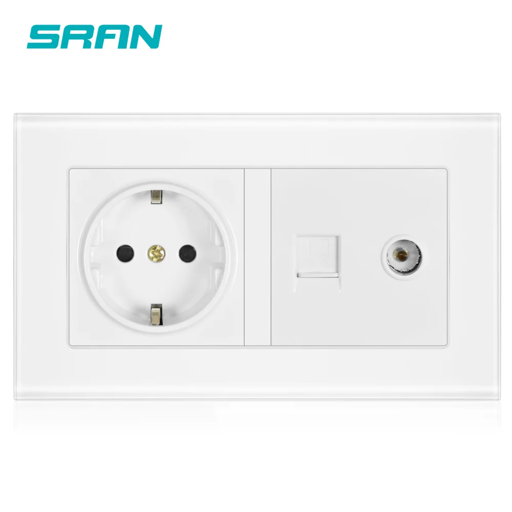 Настенная розетка SRAN, розетка европейского стандарта + гнездо для телевизора с интернет-компьютером, данные RJ45 CAT5E, закаленное прозрачное стекло, панель