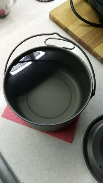 До Киева доехало за 26 дней. По дороге примяли коробку (существенно) и немного сам котелок. По качеству - очень хорошо, но не супер (крышка прилегает неплотно). На крайних фото вода залита 1 л и 1,3 л. Так что продавец не обманул с вместительностью.
