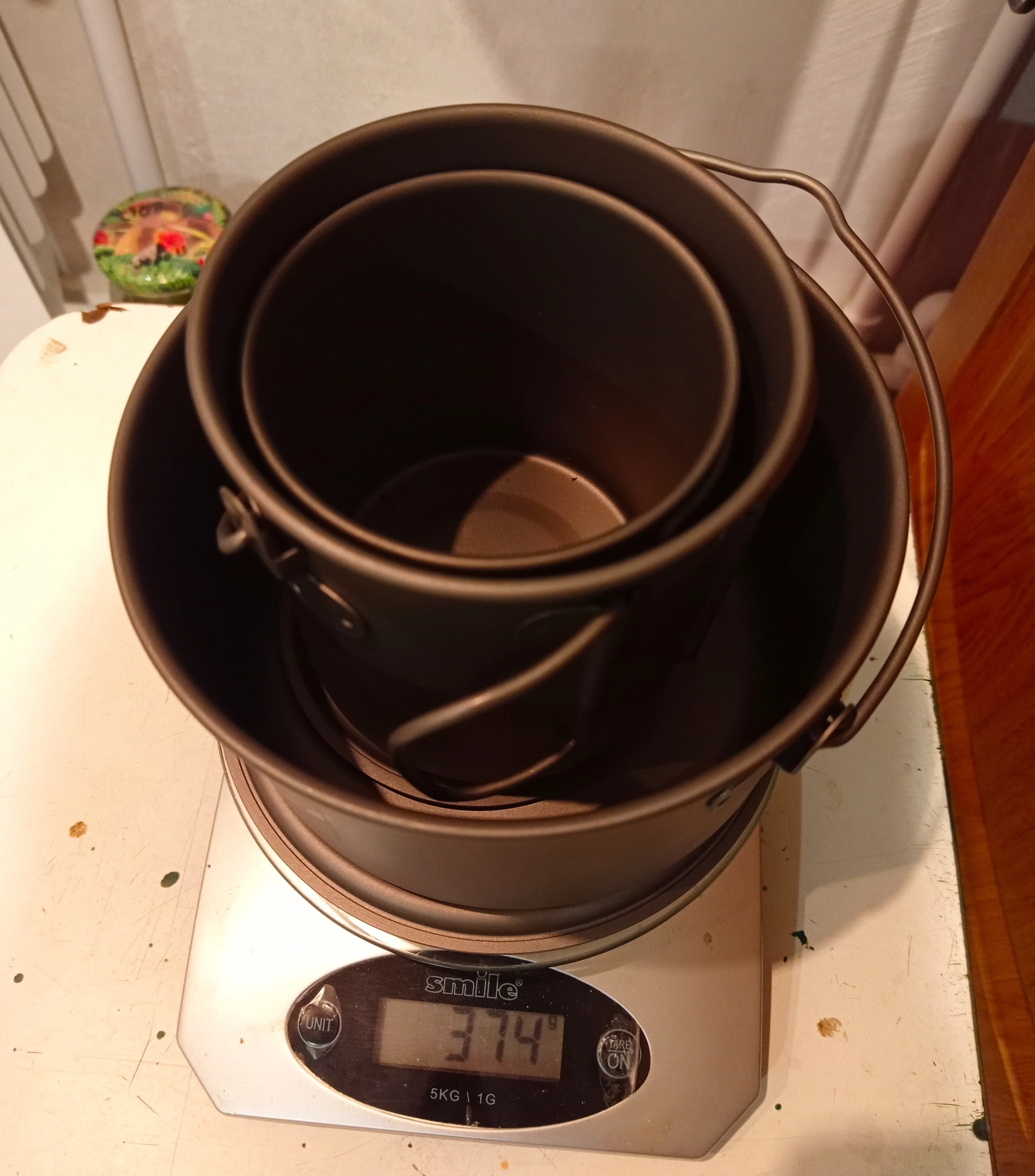 Не нашел ни одного полностью удовлетворяющего меня отзыва до покупки, поэтому пишу свой. Получил посуду за 9 дней, что быстро, с учетом того, что живу за городом (Тульская область). Вес трех предметов - кружки на 450 мл, мини-кастрюльки на 750 мл и кастрюльки на 1300 мл - 374 гр. Посуду выбирал так, чтобы помещалась одна в другую. Ручка у крышек в поднятом положении фиксируется только у мини-кастрюльки, боковые ручки - у кружки, а дужка - у кастрюльки. Тут куда ни глянь - всё не совершенно, и придется дорабатывать самому. Хотя на мини-кастрюльке есть(!) наплывы для фиксации дужки. Боковая ручка кастрюльки, как и писали, бесполезная - складывается даже под ее собственным весом. Что помешало ее приварить наоборот - загадка. Крышки держатся неплотно - чтобы прикрыть содержимое при готовке и экономии топлива. Все ручки и дужки не магнитятся. Вероятно, выполнены из того же сплава. К кастрюльке и мини-кастрюльке идёт сетчатый чехол. Брал ради легкого веса и компактности.