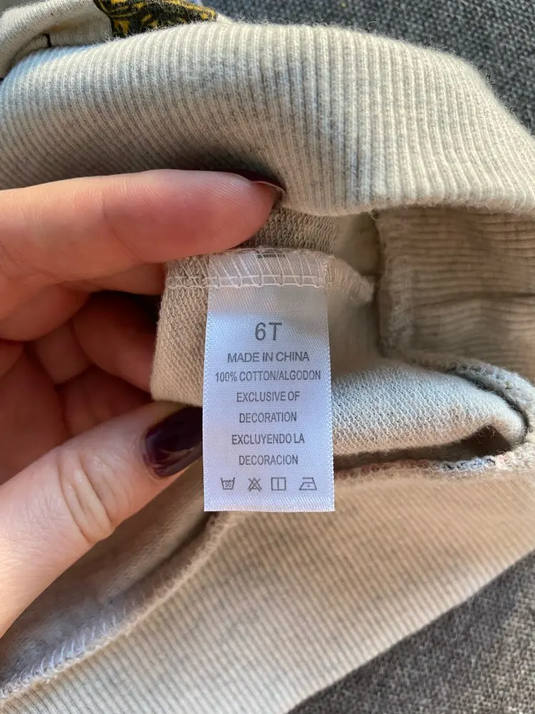 Я в восторге от качества вещи. Это уже второй подобный свитшот. Стирала и сушила в сушке. Не линяет, не скатывается. На рост 107 заказала T6. Сидит отлично, слегка свободно, но на месте за счёт резинок. T5 тоже подходит, но впритык. Качество точно лучше hm. Вещь мягкая, 100% хлопок. Классный дизайн. Пришёл довольно быстро на кассы 5. Спасибо продавцу за оперативную отправку, буду заказывать ещё.