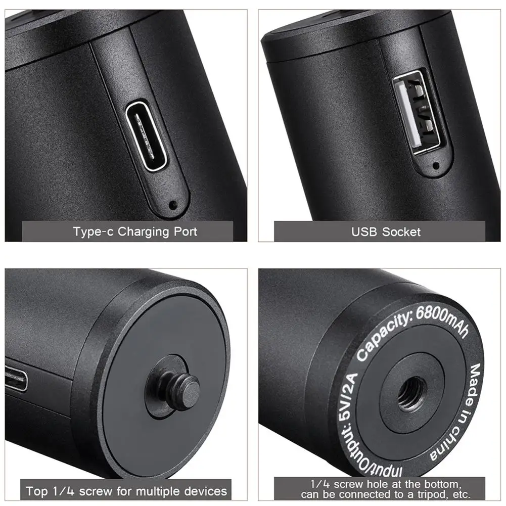 Пункты маркированного списка:1. Аккумулятор большой емкости: аккумулятор большой емкости 6800 мАч, ручка для съемки на открытом воздухе, источник питания.2. Материал алюминиевого сплава: материал алюминиевого сплава, универсальный винтовой интерфейс 1/4, поддерживает различные устройства, штативы и т. д.3. Область применения: Поддержка спортивной камеры, мобильного телефона, зарядки камеры, для Gopro, Osmo.4. Порт зарядки: Эта ручка камеры имеет зарядный порт type-C и разъем USB.5. Обратите внимание: при зарядке камеры Используйте оригинальный кабель для передачи данных.Упаковочный лист:Ручка * 1Кабель для передачи данных-1 шт