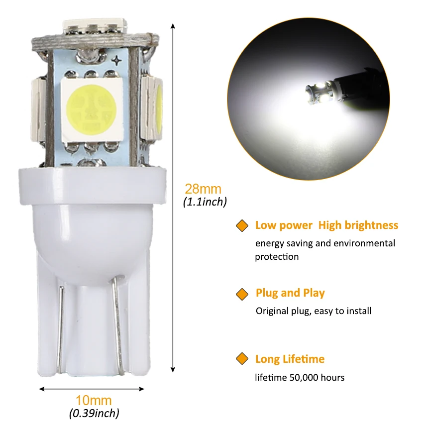 Автомобисветодиодный Светодиодная лампа T10 W5W 5050 5SMD, купольная лампа для чтения 168, 194, 192, 12 В постоянного тока, габаритная лампа для номерного знака, клиновидный свет, белый, красный, синий цвет, 10 шт.