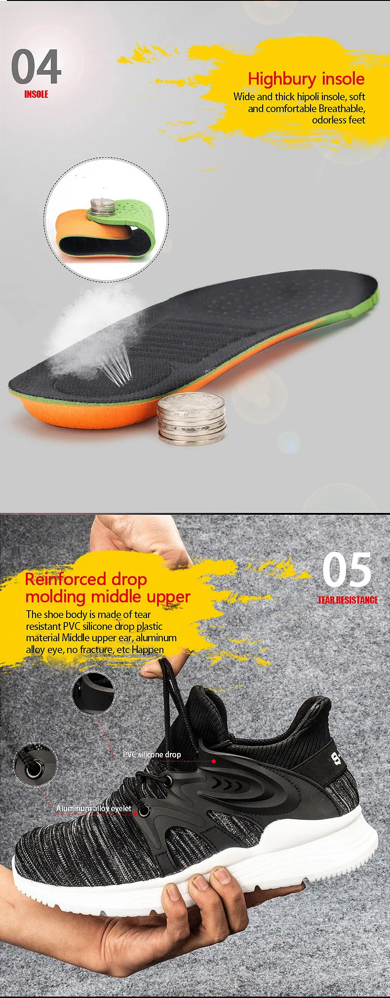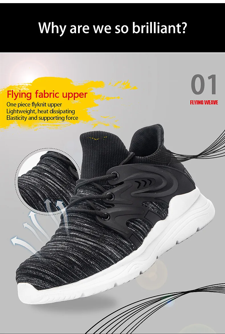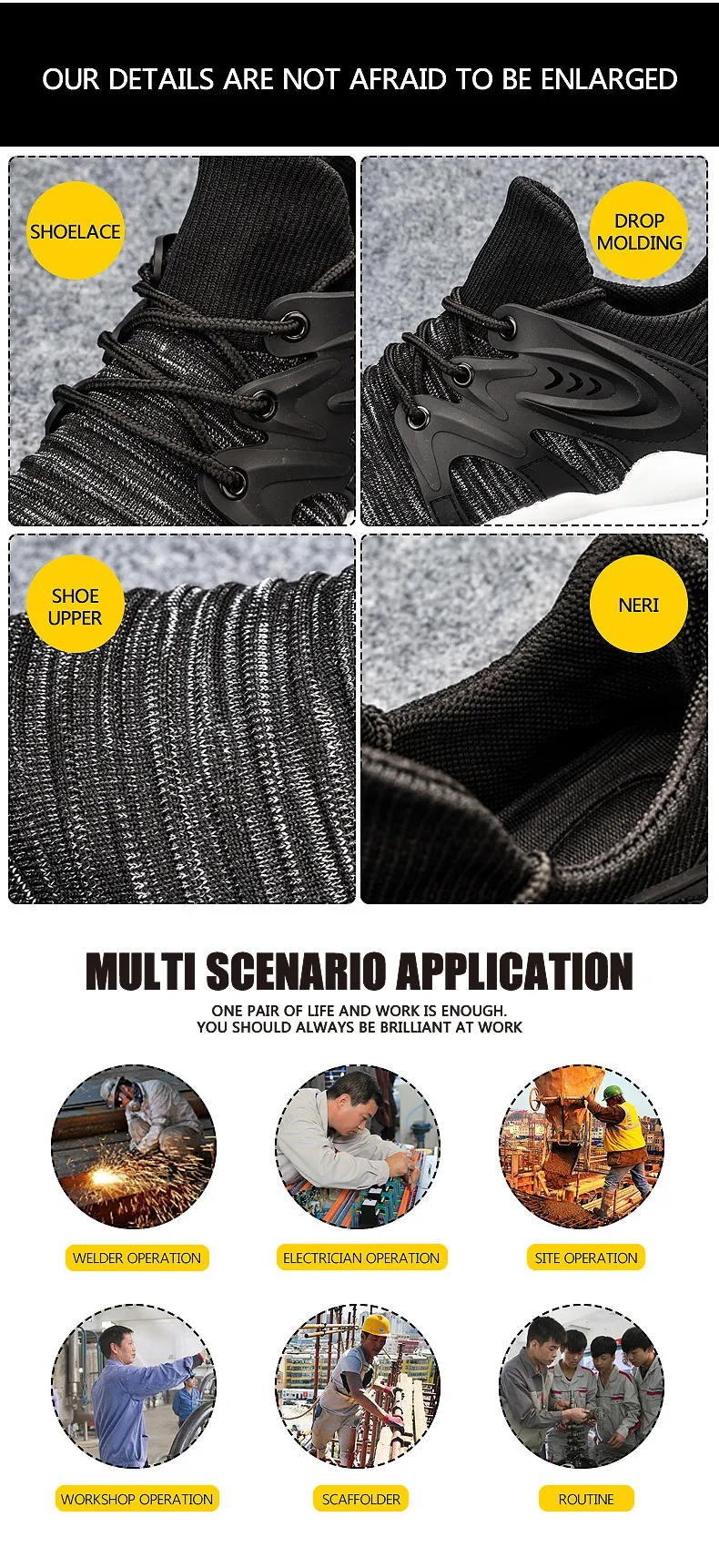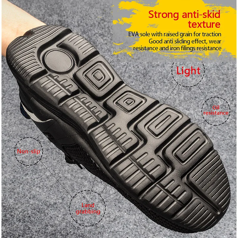 Резиновая подошва: прозрачная текстура, устойчивый захват на земле, нескользящая и износостойкая.Обувь со стальным носком: европейский стандарт, ударопрочность на стальную головку 200JПромежуточная подошва из кевлара: эта обувь со стальным носком изготовлена из кевлара, который является защитным волокном. Он может защитить ноги от проколов острыми предметами, такими как гвозди, стальной стержень.Сверхлегкая безопасная обувь: она похожа на вес пары кроссовок. Они помогут вам работать счастливо весь день, не выматывая ноги. С очень мягкими стельками и высокой эластичной подошвой ваши ноги безопасны и удобны. Трикотажный верх очень мягкий, сохраняет ваши ноги удобными и дышащими.Тяжелая Пара действительно отстой для тех, кого пытали тяжелыми рабочими днями. Эти защитные ботинки flyknit никогда не ложатся на ноги из-за общей легкой системы, которая включает в себя технически продвинутый верх flyknit и высококачественную резиновую подошву. Отлично подходит для тех, кто работает в промышленности, автопроизводстве, строительстве и производстве машин.