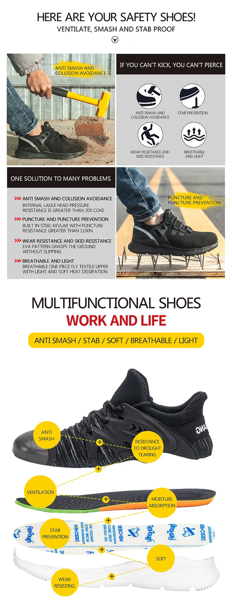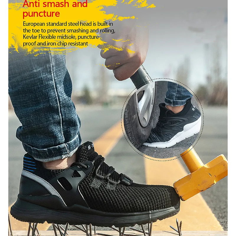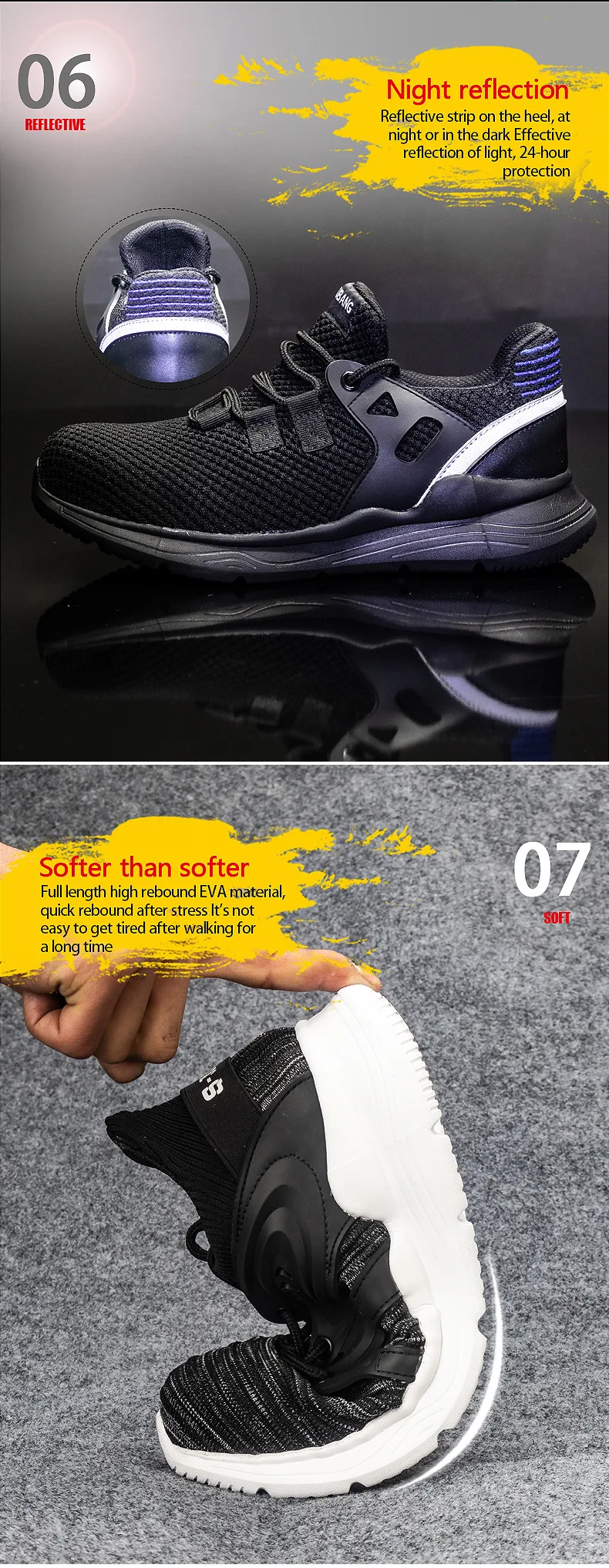 Резиновая подошва: прозрачная текстура, устойчивый захват на земле, нескользящая и износостойкая.Обувь со стальным носком: европейский стандарт, ударопрочность на стальную головку 200JПромежуточная подошва из кевлара: эта обувь со стальным носком изготовлена из кевлара, который является защитным волокном. Он может защитить ноги от проколов острыми предметами, такими как гвозди, стальной стержень.Сверхлегкая безопасная обувь: она похожа на вес пары кроссовок. Они помогут вам работать счастливо весь день, не выматывая ноги. С очень мягкими стельками и высокой эластичной подошвой ваши ноги безопасны и удобны. Трикотажный верх очень мягкий, сохраняет ваши ноги удобными и дышащими.Тяжелая Пара действительно отстой для тех, кого пытали тяжелыми рабочими днями. Эти защитные ботинки flyknit никогда не ложатся на ноги из-за общей легкой системы, которая включает в себя технически продвинутый верх flyknit и высококачественную резиновую подошву. Отлично подходит для тех, кто работает в промышленности, автопроизводстве, строительстве и производстве машин.