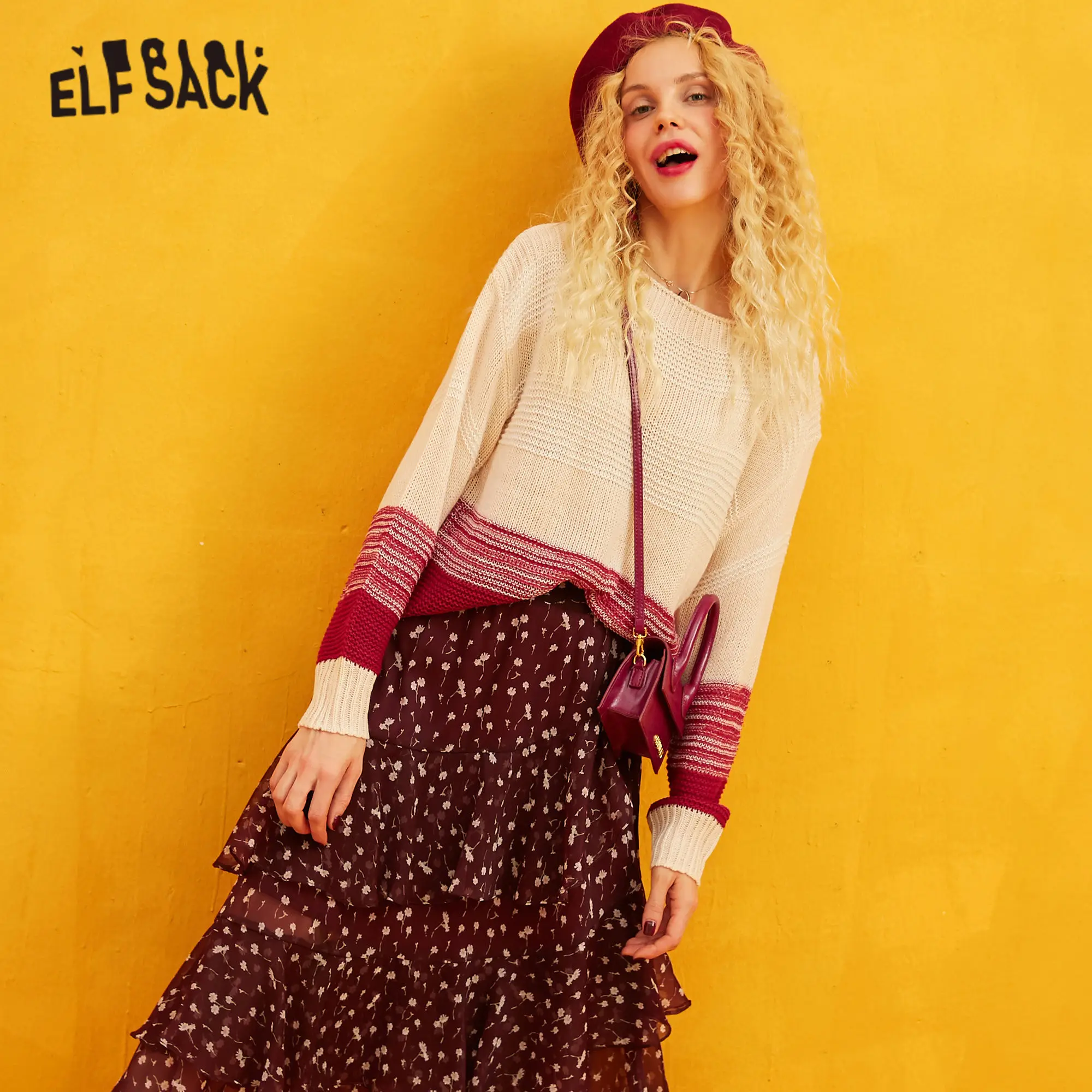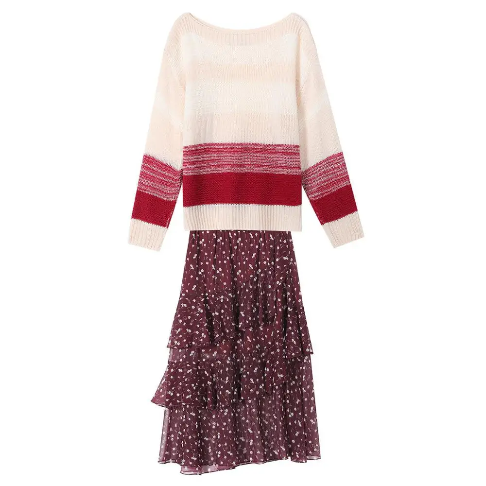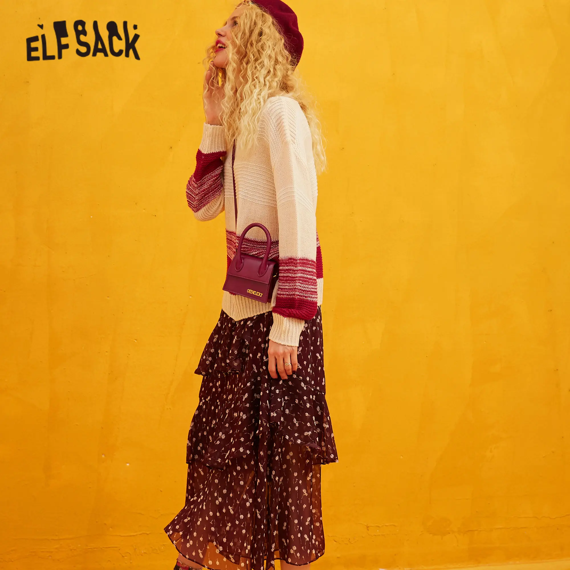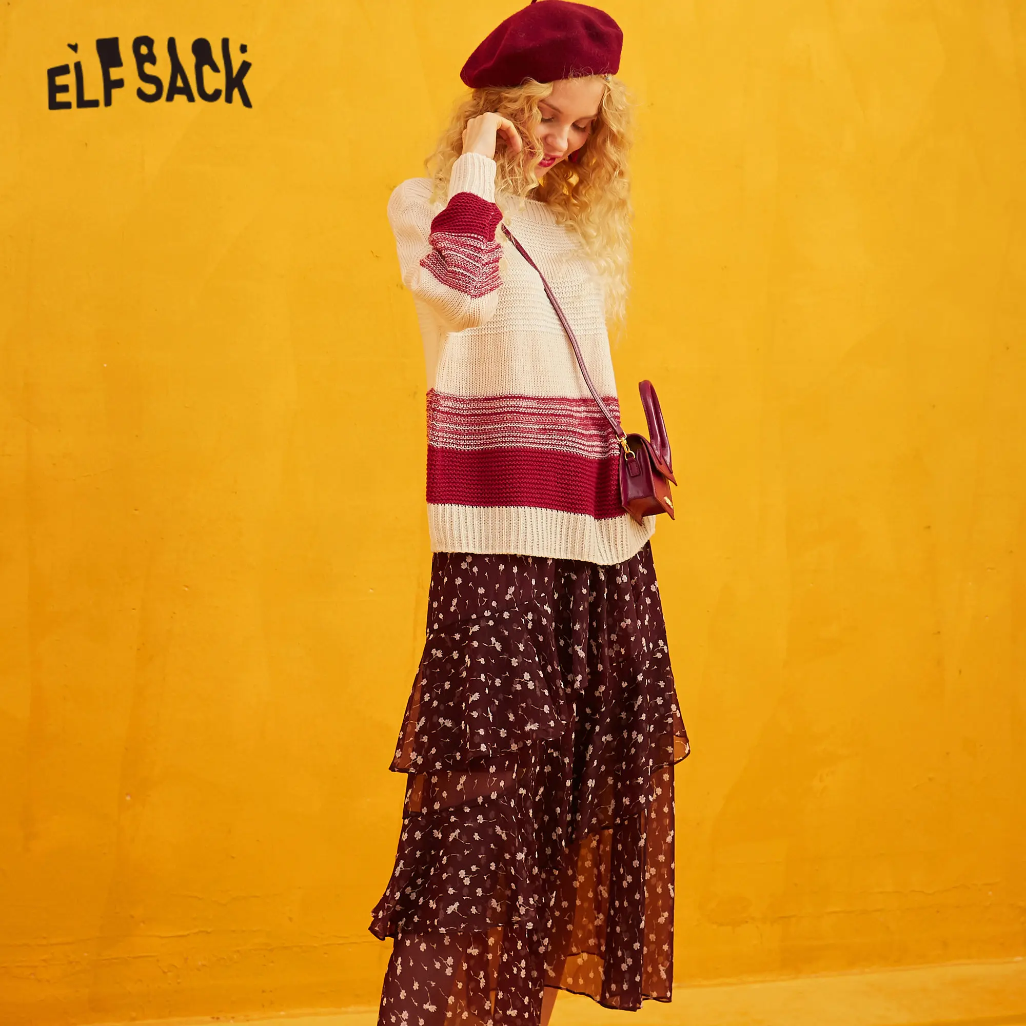ELFSACK бордового цвета, вязаный пуловер в полоску, повседневные комплекты для женщин, 2020 Зимний цветочный шифоновый многослойный элегантный женский костюм из двух частей