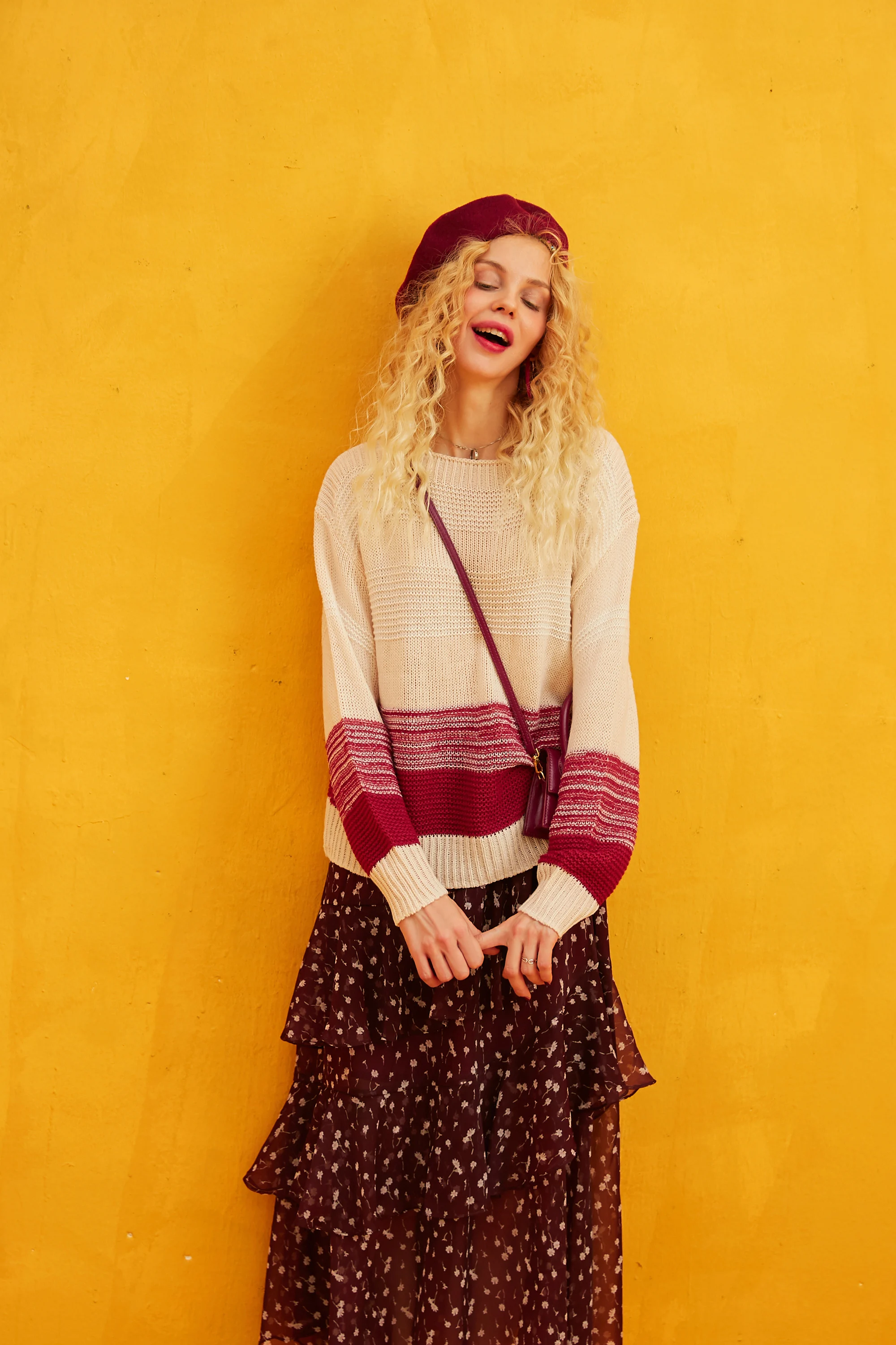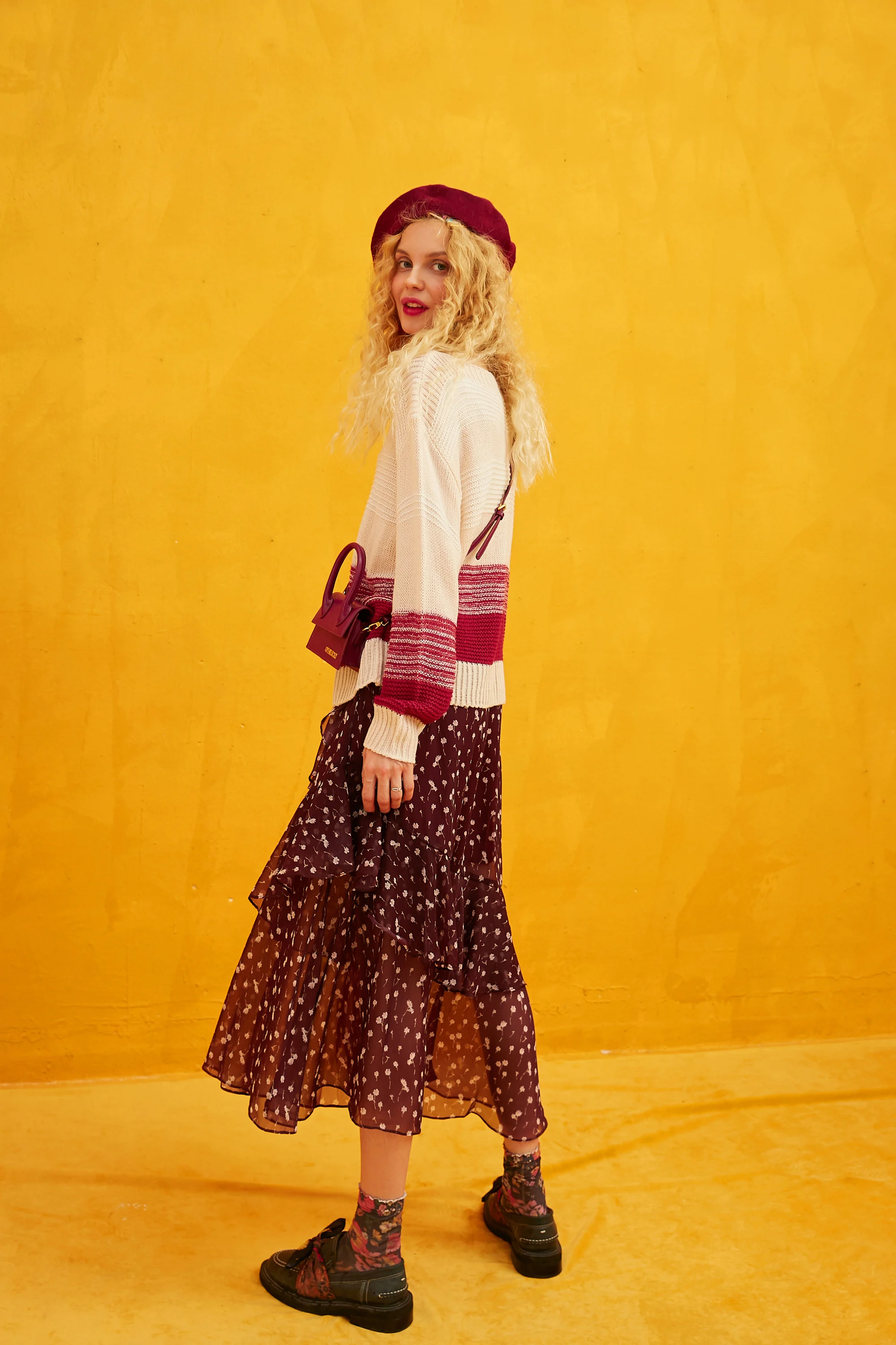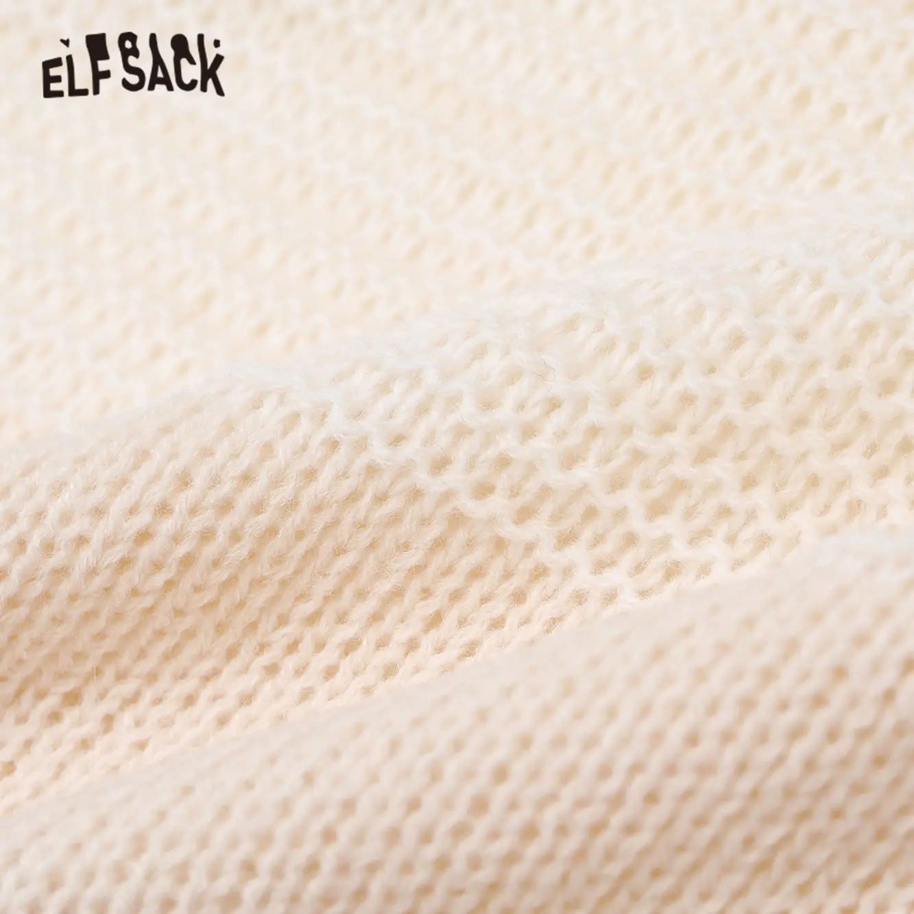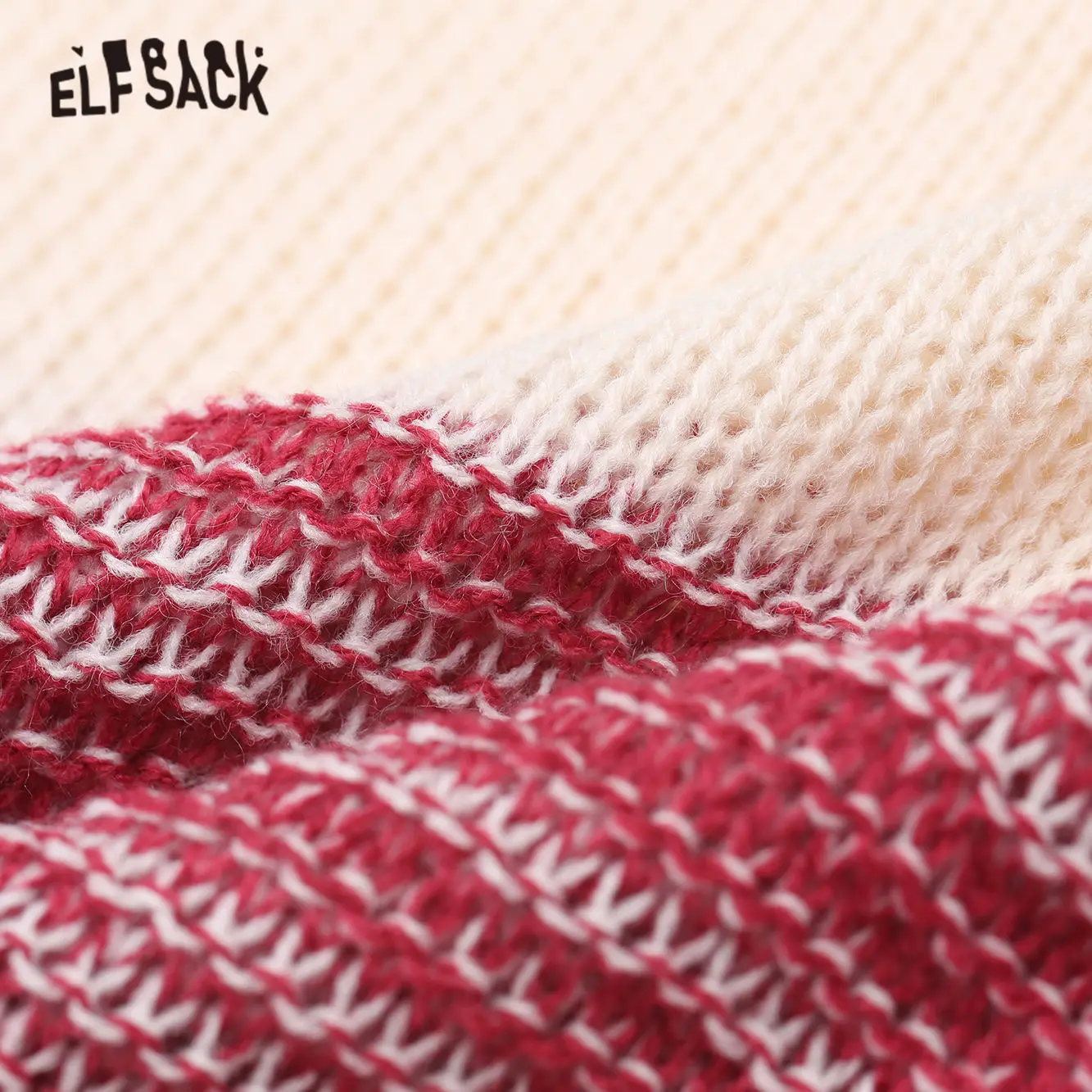 ELFSACK бордового цвета, вязаный пуловер в полоску, повседневные комплекты для женщин, 2020 Зимний цветочный шифоновый многослойный элегантный женский костюм из двух частей