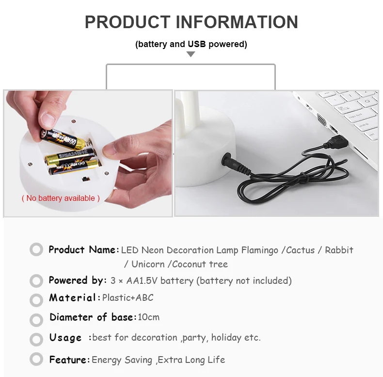 Светодиодный неоновый светильник с фламинго, единорогом, КАКТУСОМ, USB