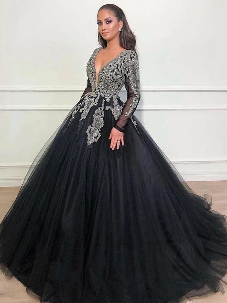 Лори Дубай Арабский черный бальное платье вечерние платья V образным вырезом с длинными рукавами блестками Бусины кружева аппликации выпускного бала Бальные платья