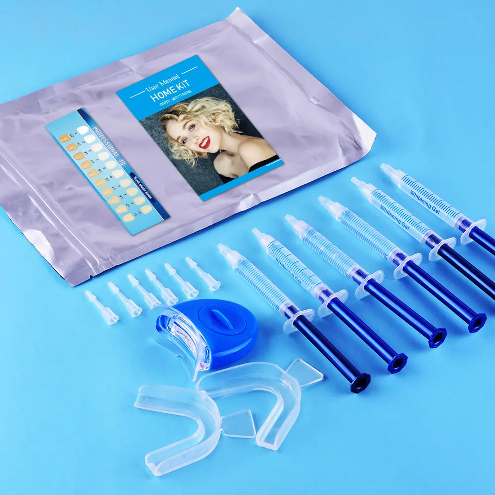 Посылка включает в себя 6 * отбеливающий гель (3 мл на) 2 * последний дизайн термоформы одиночные арки лотки 1 * мини холодный светильник, отбеливающая лампа 1 * Профессиональная 3D направляющая для затенения зубов