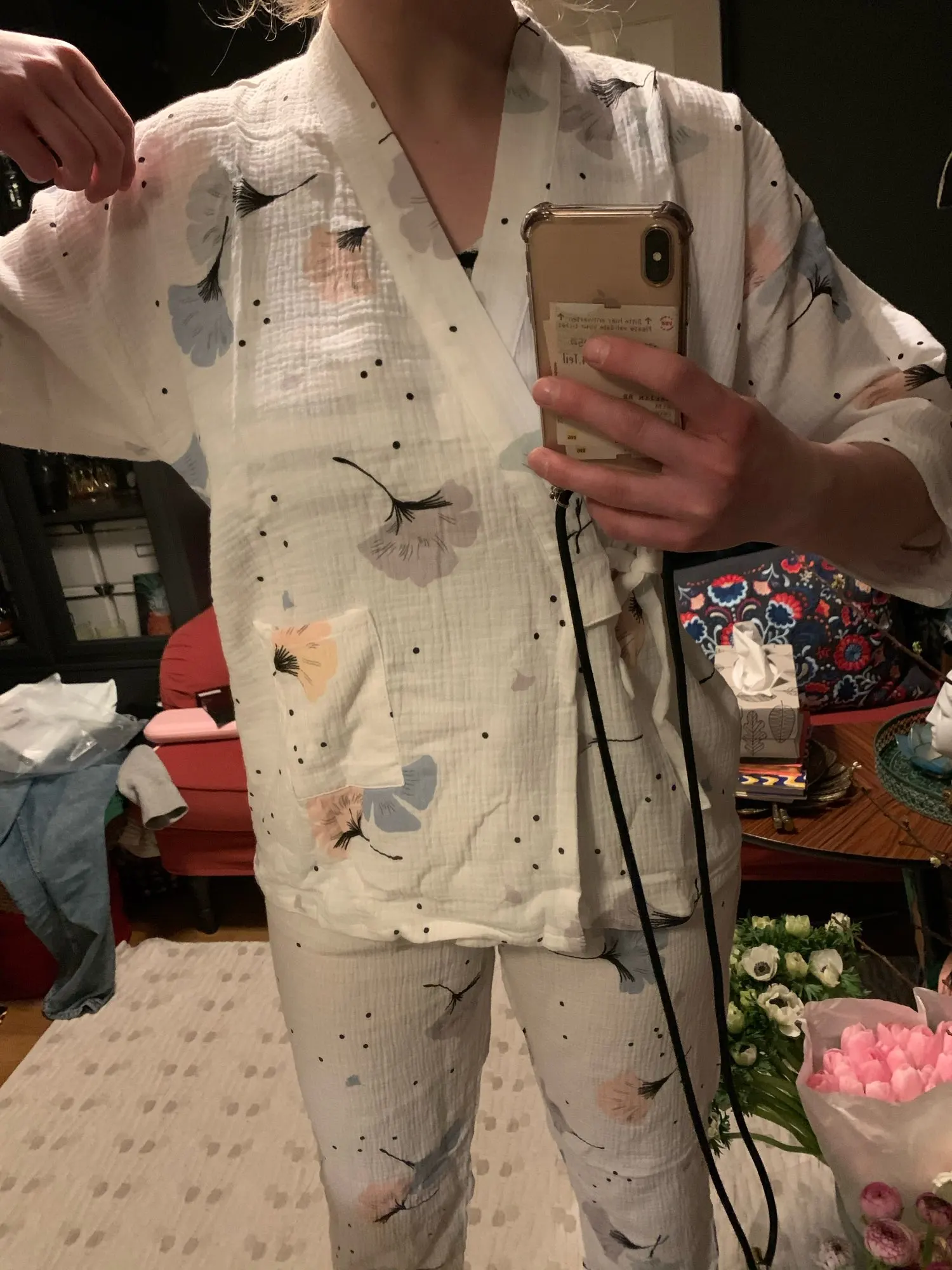 пижама потрясающего качества, тонкий и мягкий муслин, легкая, отлично скроенная и сшитая. хочу ещё десяток таких)