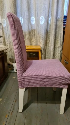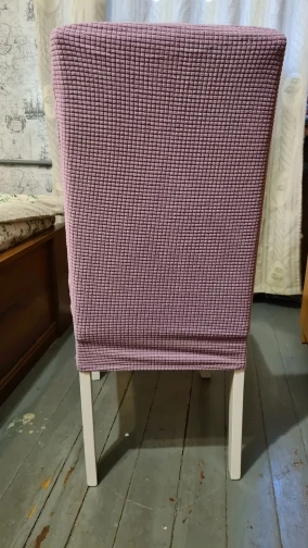 Переживали что не совпадёт оттенок, заказал всего два, но повезло и он совпал. Не верьте всем подряд фоткам в отзывах. Прога по умолчанию в моём умнофоне снимает в розовом (см. фото, на всех четырёх один и тот же чехол). И чтобы изображение отразило реальный цвет его пришлось корректировать вручную, что я и сделал (3-я и 4-я показывают правильный оттенок). Всё сходится. Чехлы оказались на ощупь приятнее, чем ожидалось: очень мягкие и ребристые. Резинки отличные. Из-за своей универсальности, в верхней части спинки немного узковаты на наши стулья. Однотонные смотрятся лучше, чем с рисунками. Куплены со скидкой и с купоном, за 567 рублей. Покупкой доволен! Рекомендую! Теперь жалею что сразу не взял четыре.