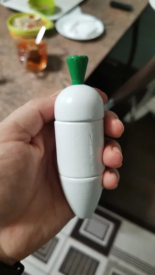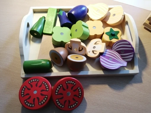 Чуть мельче ожидаемого, магниты держат слабо, игрушка разваливается в руках, на некоторых овощах видно, что отшлифованы не очень и сразу покрыты краской, где-то краска и вовсе содралась, на огурце/кабачке вовсе пятно на краске. В итоге никакой товарный вид, досточка для нарезки тоже вся в пятнах от краски, нож в том числе, порадовал только помидор и ящик для хранения, но этого явно мало для такой цены, буду открывать спор на возврат части суммы.