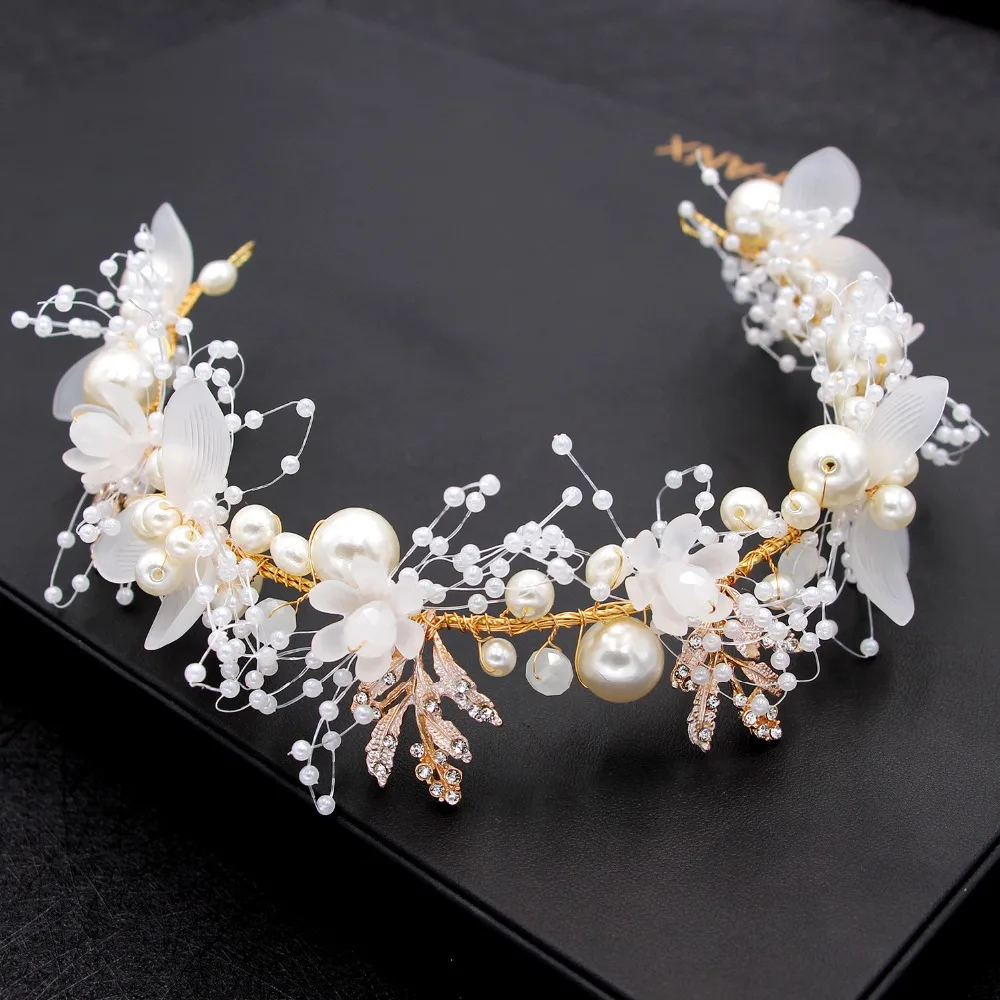 Повязка на голову с жемчугом и золотыми цветами, тиара, свадебные п...