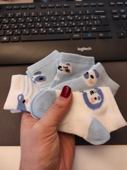 Носочки супер! Мягкие, лёгкие, красивые. Мы правда размер на 2 года, одели в 4 месяца, есть запас чуть чуть. Возможно больше поносим, чем все, купленные ранее. Очень довольно, что у паковано в пакетик с защелкой и без соединительных нитей, то есть не нужно все срезать, после чего порой остаются дырки. Просто аккуратно сложенные носочки. Я довольна!