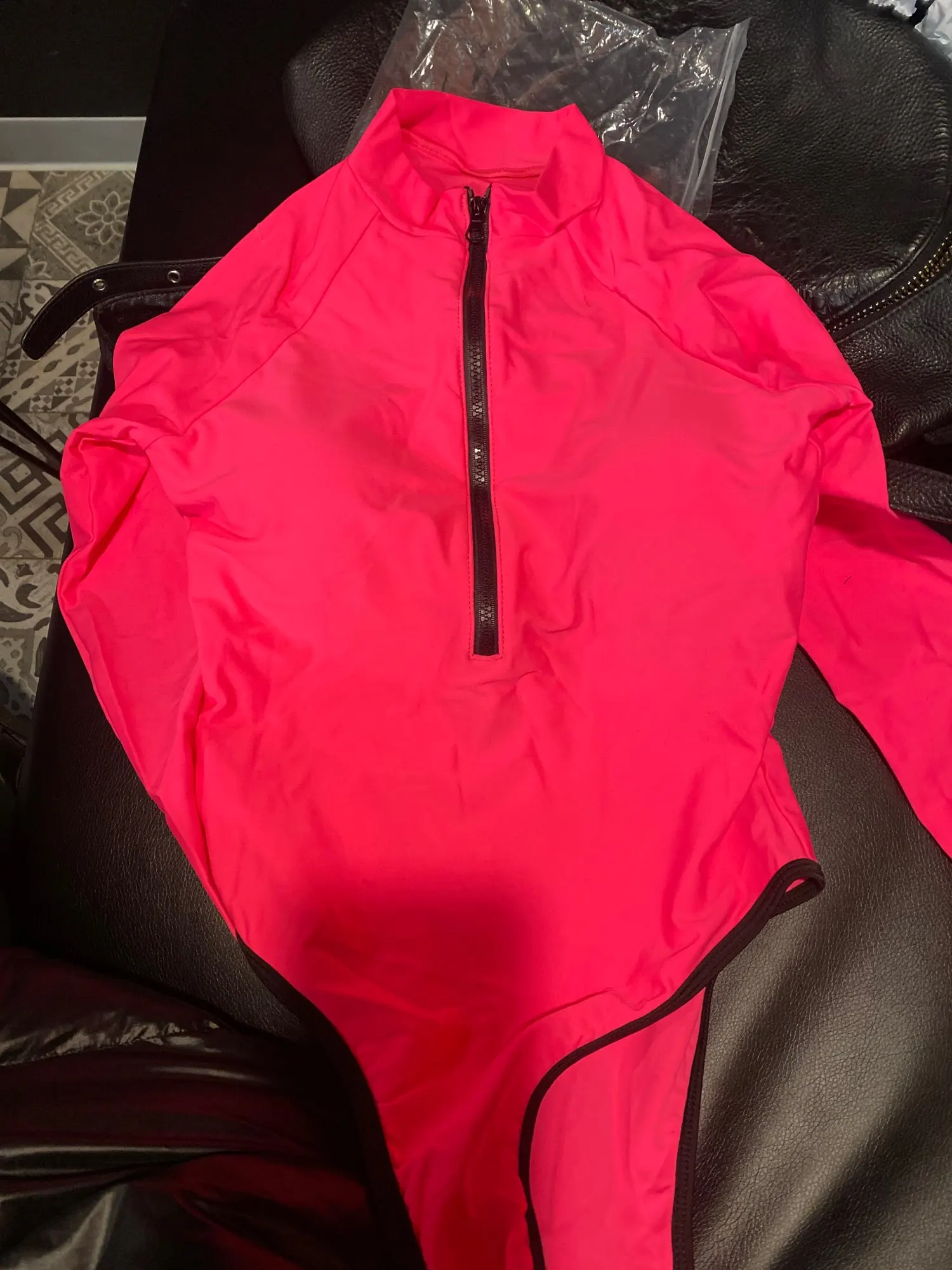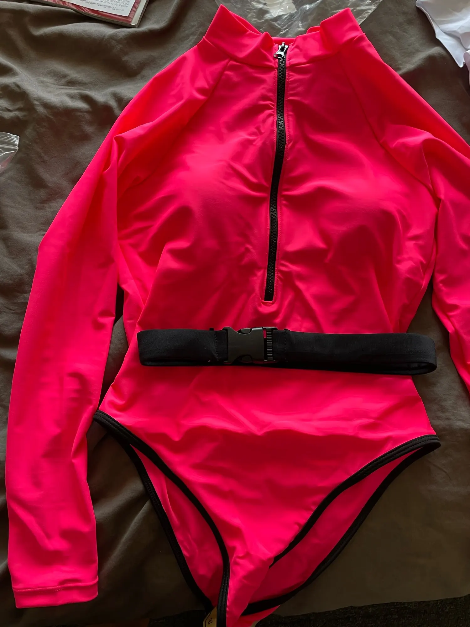 Яркий купальник, быстрая доставка. Материал более резиновый чем обычно купальники с Али. Имеет резкий неприятный запах. Цвет крутой, как на картинке, чашки есть но не закреплены и молния уходит внутри купальника ниже чем видно и достаточно сильно колется. Ещё что меня не порадовало это свободное горло, не в обтянут и торчит. Я бы порекомендовала его долларов за 8-10$, практически ща 20$ думайте сами надо ли оно вам.