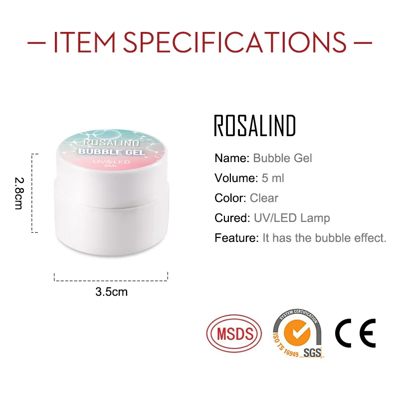 Бренд: ROSALIND Название: гель-пузырь Объем: 5 мл Цвет: прозрачный Излеченная: УФ/Светодиодная лампа Особенность: эффект пузыря.