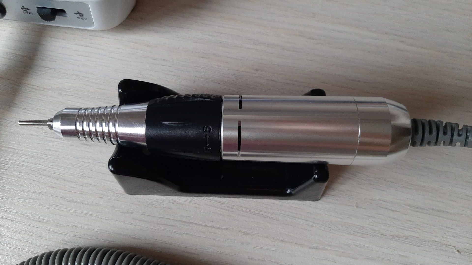 Пришёл за два дня из Москвы в Москву. Аппарат хороший, работает тихо, слегка вибрирует. Педаль работает только для включения и выключения, смысла в ней не вижу. Реверс есть, переключается. Вилка российская. Ручка удобная и не тяжёлая. Все хорошо, но для профессиональных мастеров не пойдёт, не выдержит поток клиентов.