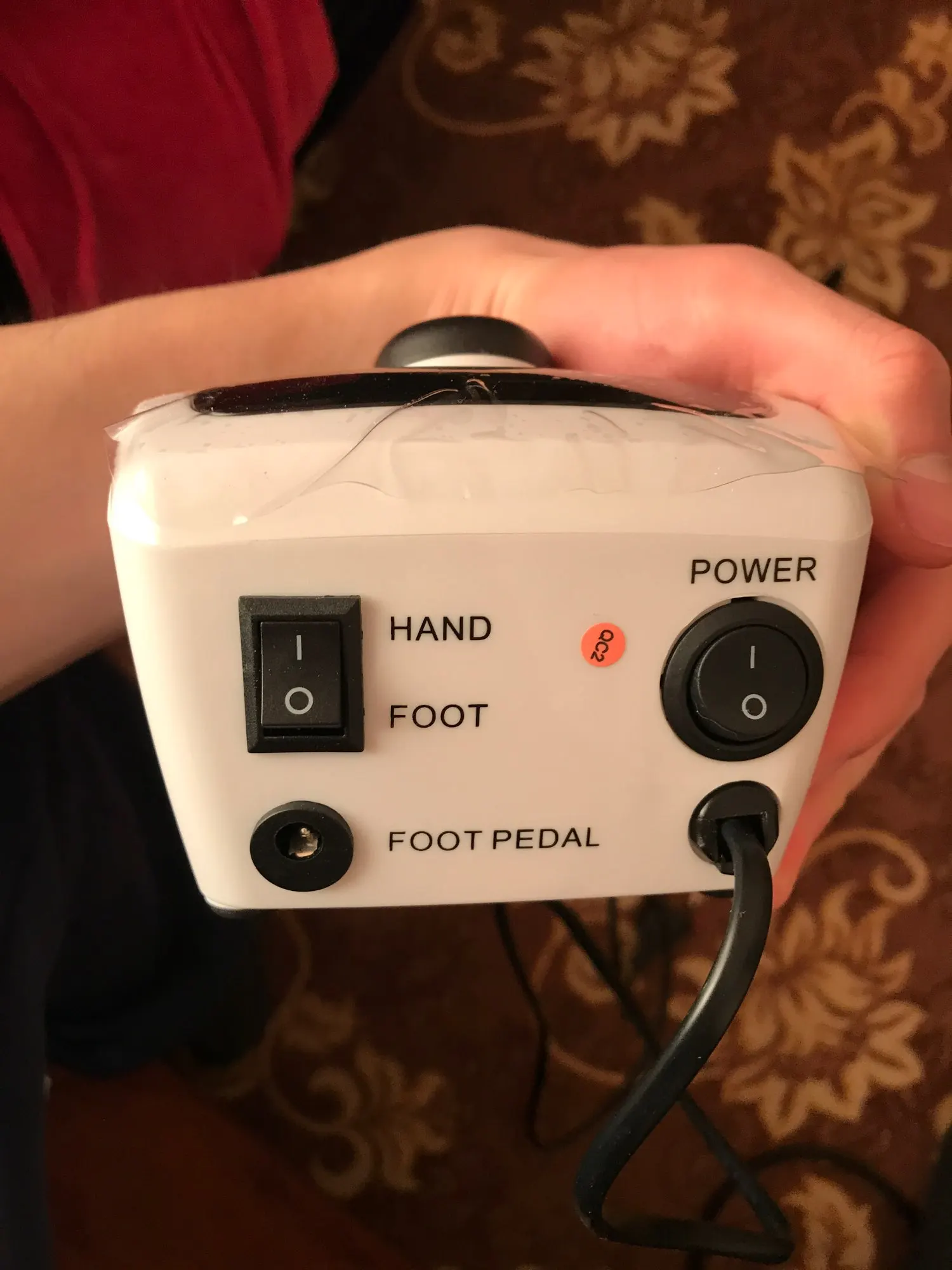 Очень хороший аппарат! Отлично подойдёт для дома и для не большого потока клиентов. Шустрый, тихий, миниатюрный. От педали работает, предать нужно держать нажатой. Ручка металическая, не люфтит, не вибрирует. В общем покупкой довольна, рекомендую. Доставка очень быстрая, 7 дней до Иркутской области, курьер принёс домой.