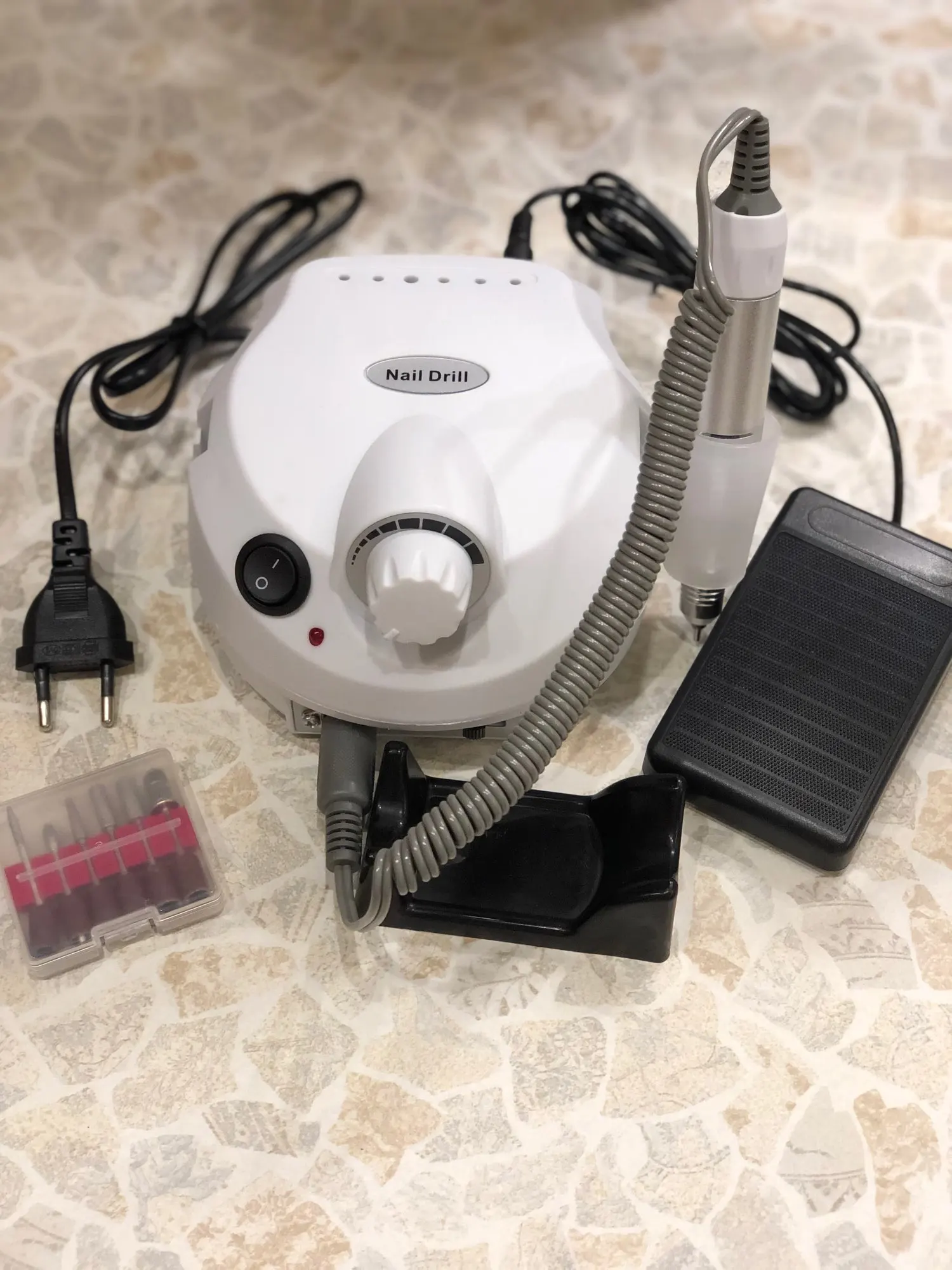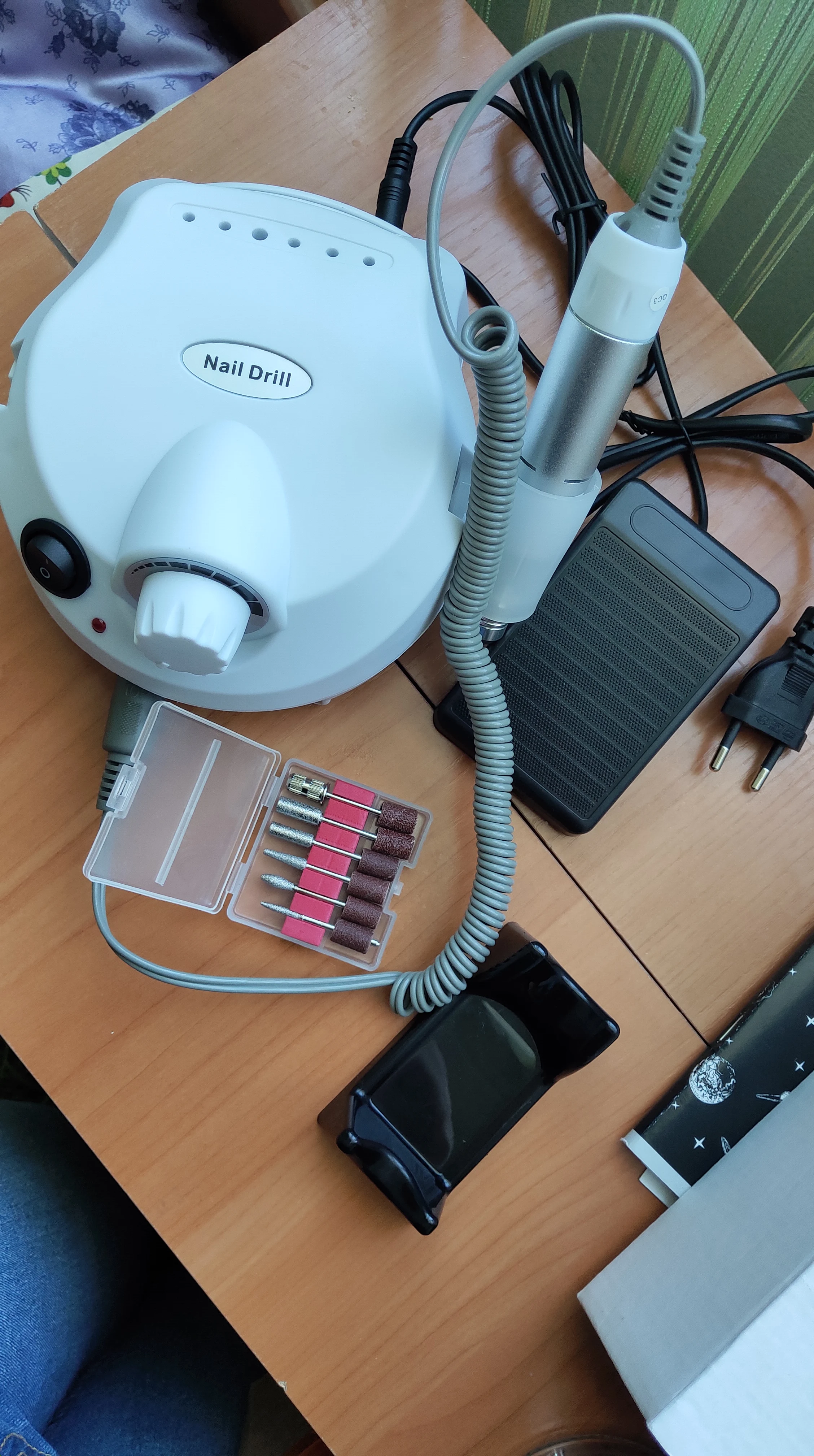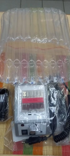 Пришёл аппарат в СПб за 4 дня с доставкой на дом. Аппаратик работает, ручка (слава богу) не вибрирует, фрезы с комплекта вставляются хорошо и не болтаются. Фрезы из набора без дефектов, но с минимальной абразивностью. Хотела выпилить ступеньку сзади ногтя от акрилатика, материал фреза не сняла, лишь немного подпилила. Медальку тоже подключала, все работает. В целом аппарат понравился, такой миниатюрный, не шумный (мне, как новичку, страшнее было бы орущей ручкой по ногтю елозить). Один минус- короткий провод с вилкой, но это в принципе стандартная длина для подобной техники. Попробую обязательно с другими фрезами дополню отзыв)