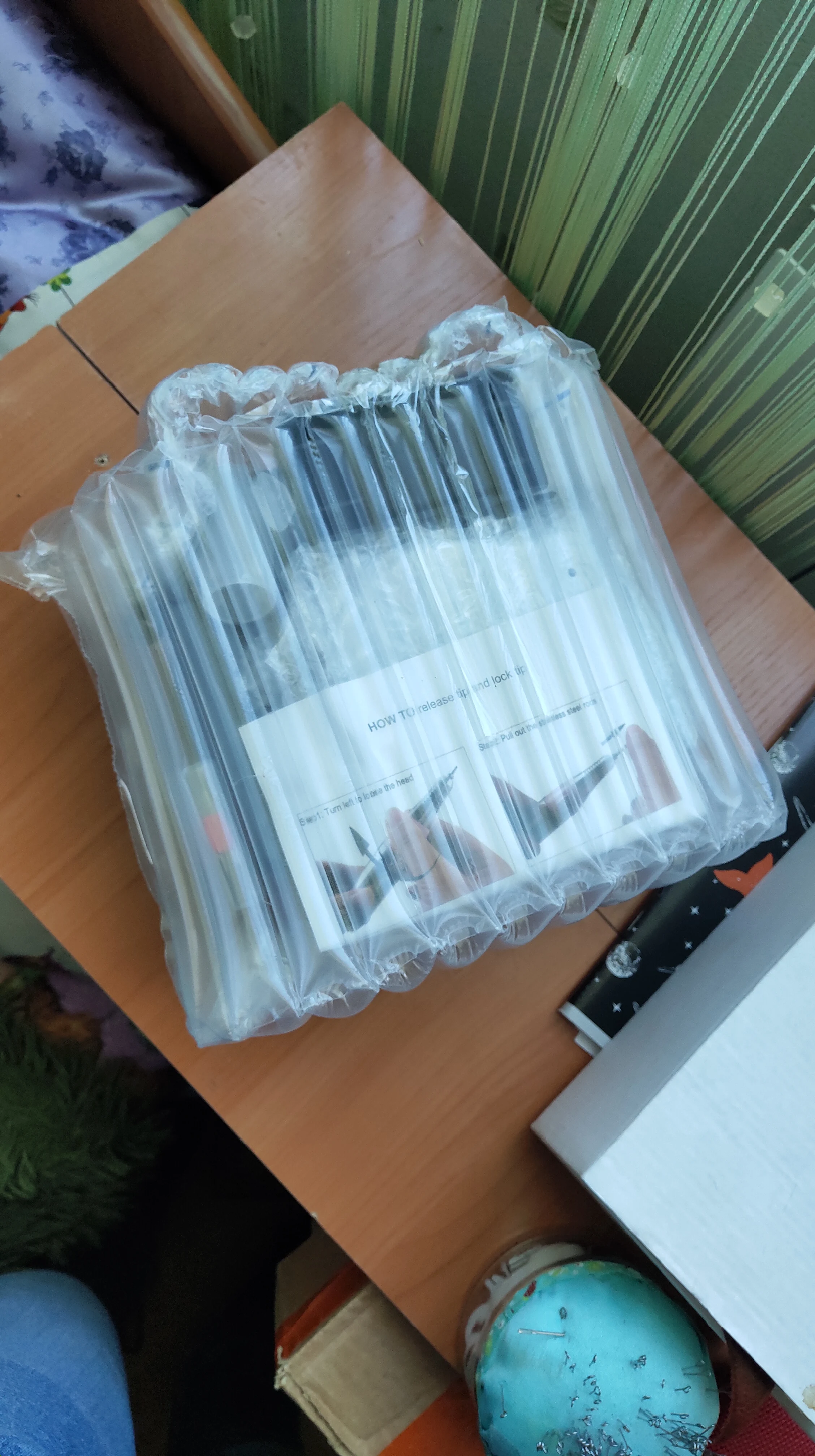Доставка 6 дней,в плёнке,все работает, разбит пластик на фрезах. На работу не влияет,я новичок. Фрезы заказала другие.Пробовала на муже,вроде не бьёт фреза по ногтю,не греется ручка. Я довольна! Спасибо продавцу!