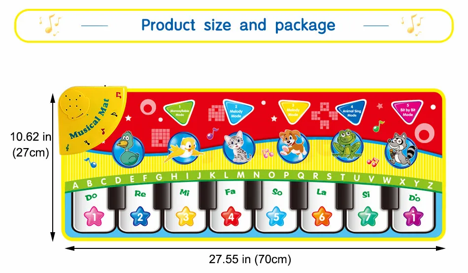 -Музыкальное одеяло имеет нескользящий слой. Но будьте осторожны при выполнении напряженных упражнений на гладкой поверхности. -За Младенцами и малышами необходимо следить родители, чтобы избежать падения во время игры Коврик для пианино. -Пожалуйста, используйте цинко-марганцевые сухие батареи для этого музыкального коврика. Щелочная батарея может сжечь доску.