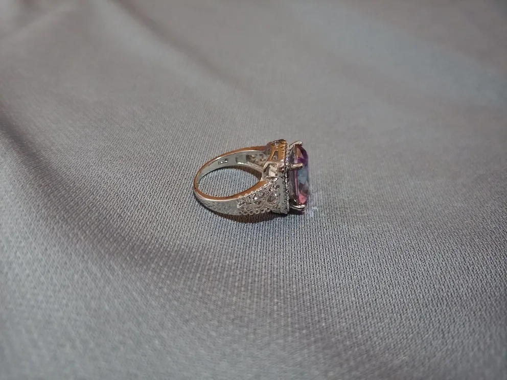 красивое, цвет камня (это не пластик) светлее обычного циркона мистик из ювелирных магазинов, размер оказался большой, у меня 16 указательный, но кольцо ближе к 17,по таблице примерно так и должно быть, поэтому всё в порядке, внутри так называемая проба