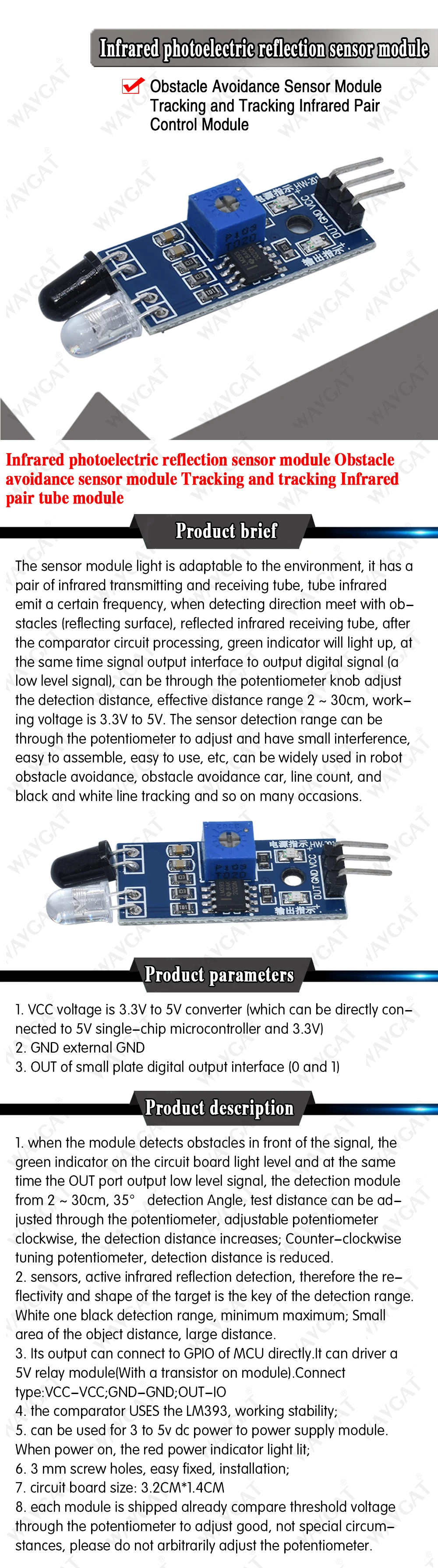 Хороший інфрачервоний датчик наближення за невисоку ціну. Доставка в Київ Укрпоштою за 27 днів. Товар відстежувався з моменту замовлення. Товар упакований в заводську упаковку і протиударний транспортувальний пакет. Плата модуля зроблена добре, монтаж якісний. Працює датчик добре, має цифровий вихід і спрацьовує на відстані до 10 см. Товаром повністю задоволений. Рекомендую продавця і його товар.