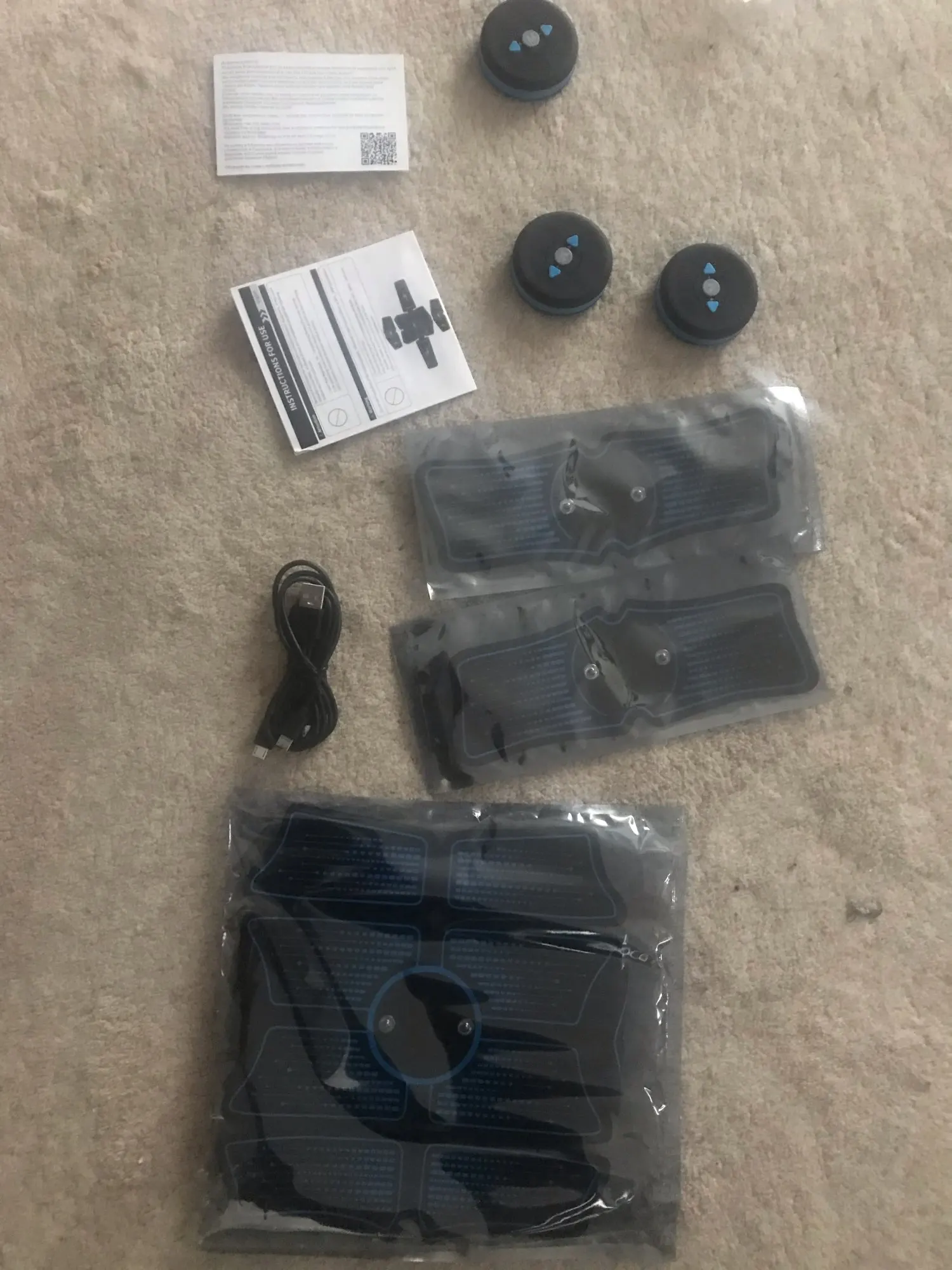 Доставка быстрая, курьером СДЭК. Стимулятор классный, мышцы от тока хорошо сокращаются. Напряжение в мышцах хорошо ощущается. Размер гелевых подушечек 6х4 и 15х5. Заряжается от сети через адаптер (в комплект не входит). Инструкция на английском. Очень довольна покупкой. Рекомендую. Продавцу спасибо за товар и вложенный подарок.