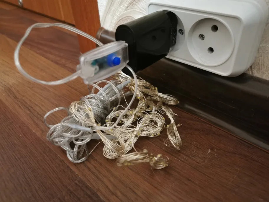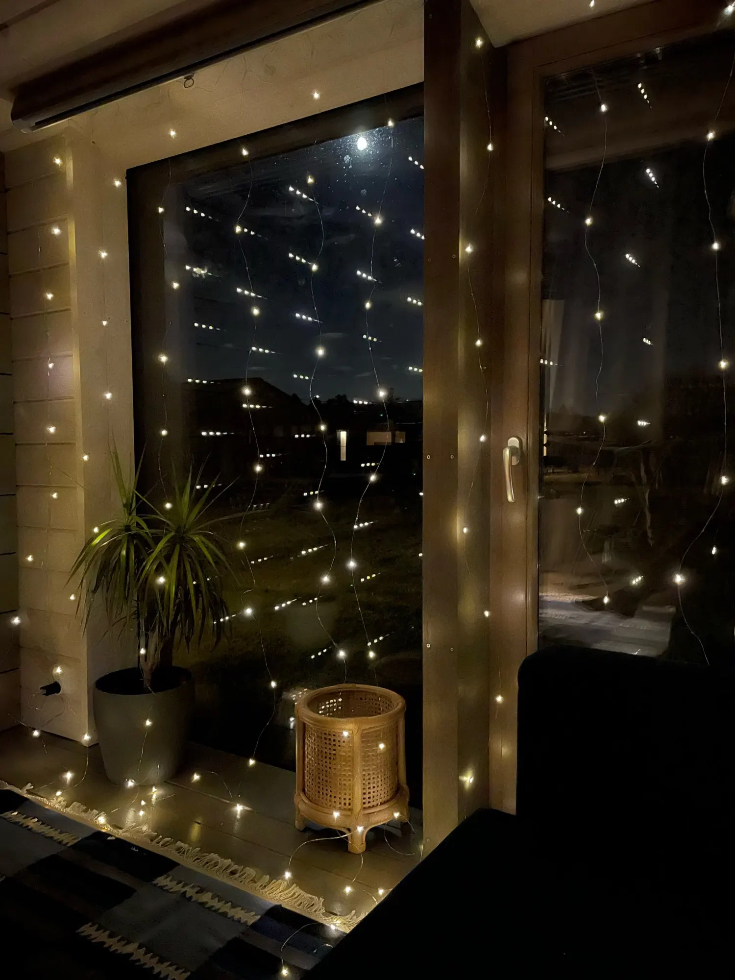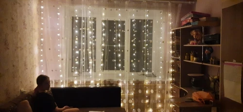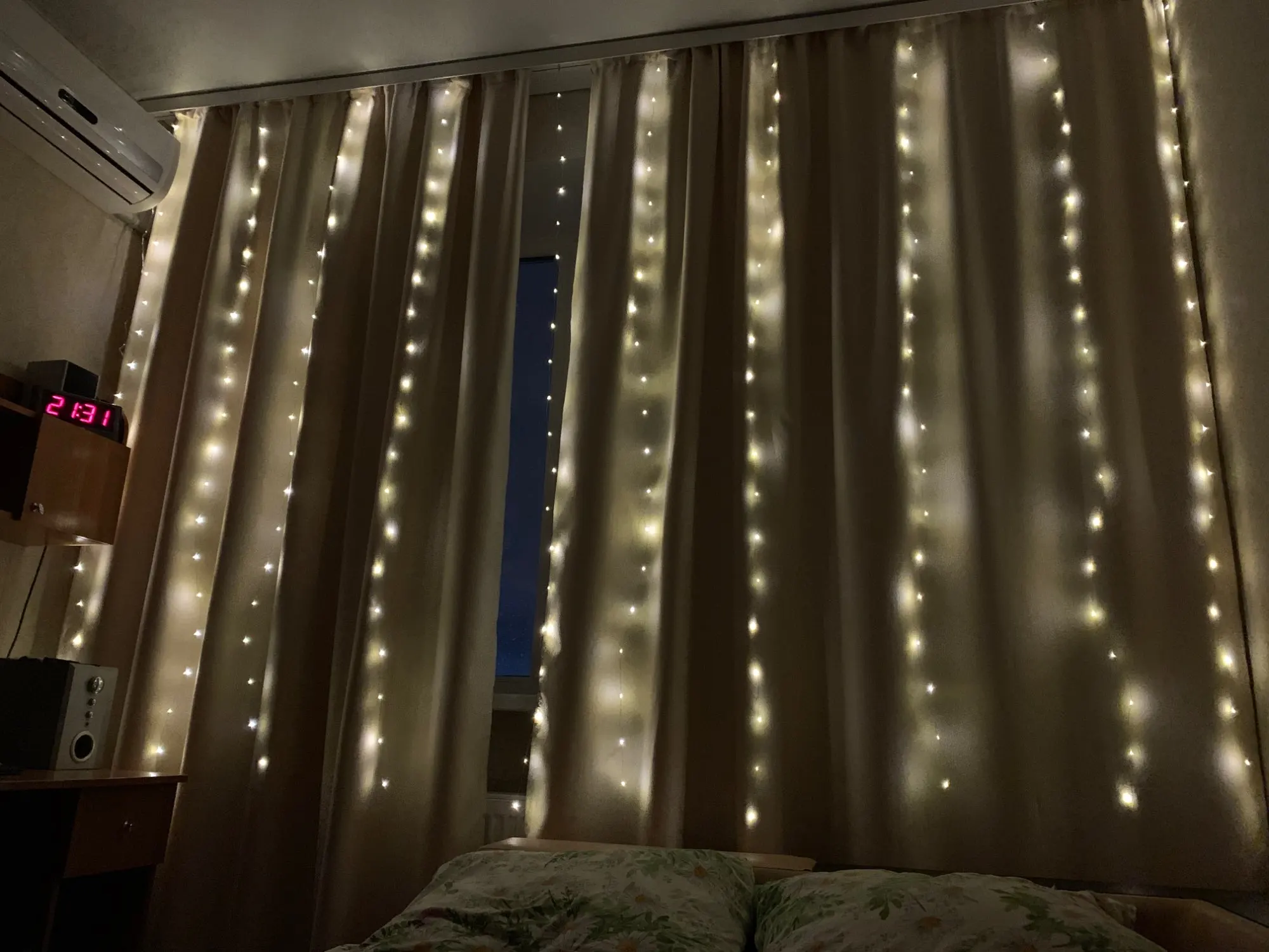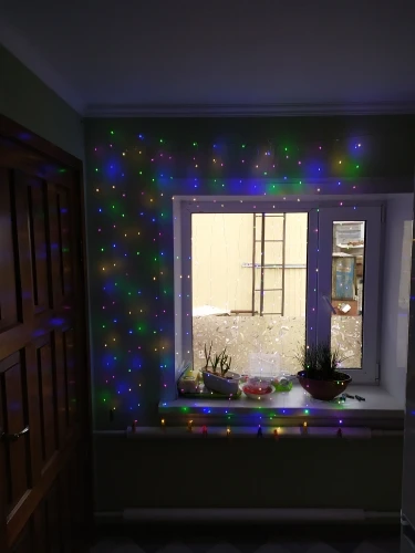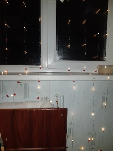 Экспресс-доставка до СПб заняла 5 дней. Посылка пришла в постомат магазина Пятёрочка. Качество отличное. В комплекте идёт пульт ДУ (необходимо докупить батарейку CR2025). Имеется 8 режимов подсветки от мигания до непрерывного свечения, настройка яркости, таймер и кнопки вкл/выкл. Расстояние между диодами по вертикали - 10 см, по горизонтали между нитями гирлянды - 20 см. При покупке опасалась, что расстояние в 20 см - это много, гирлянда будет смотреться «лысо», придётся докупать вторую. Но за счёт отражения в окне опасения не оправдались, она и так смотрится эффектно. Через пару дней кошка откусила сантиметров 20 провода диодной части, но гирлянда не перестала работать.