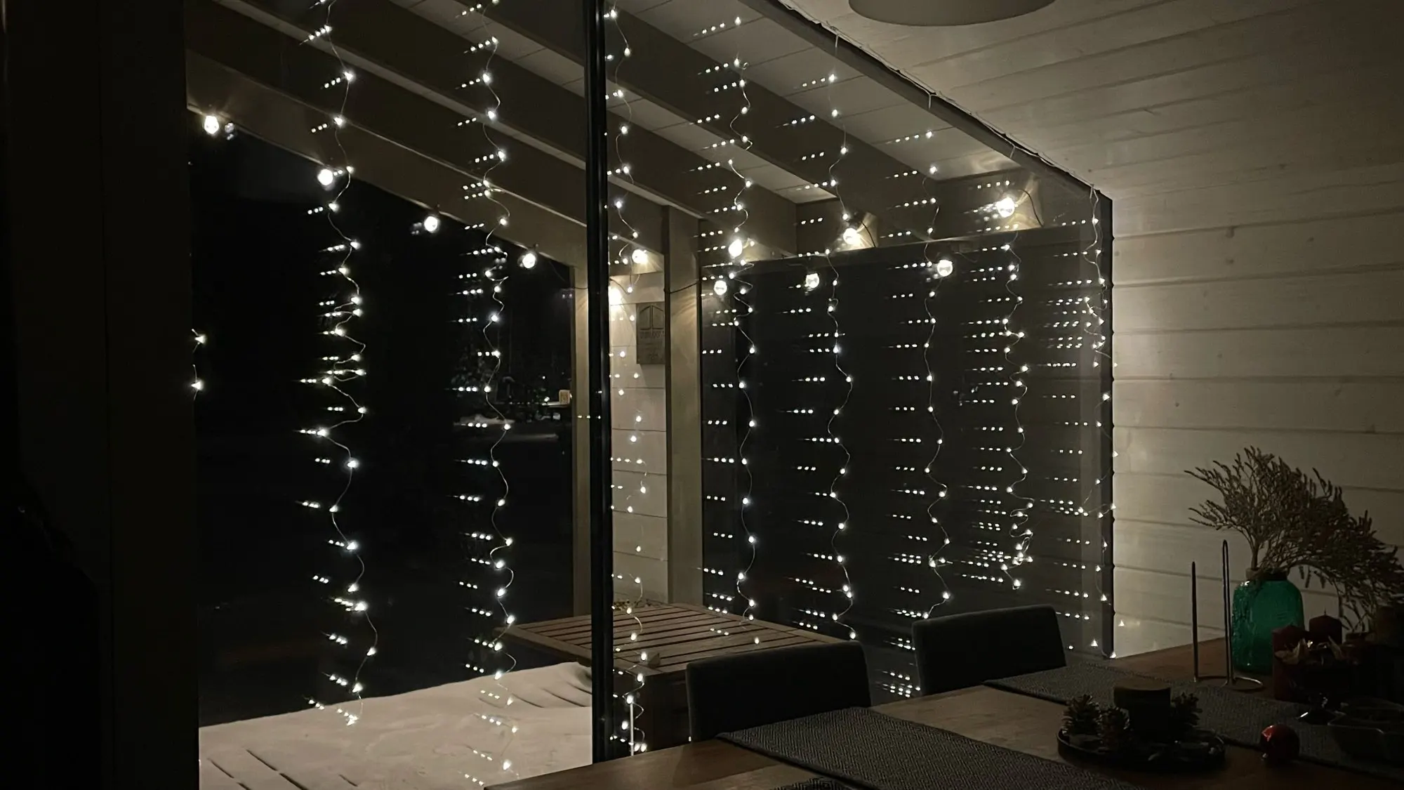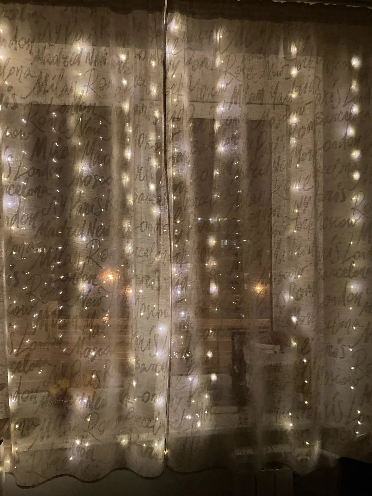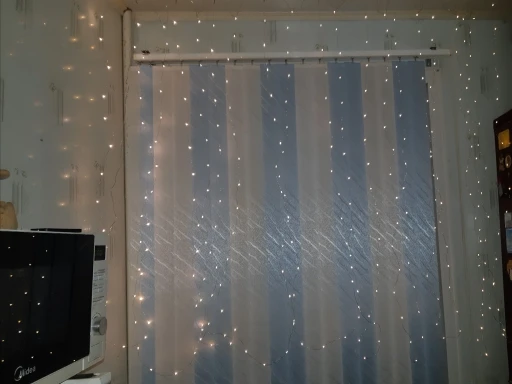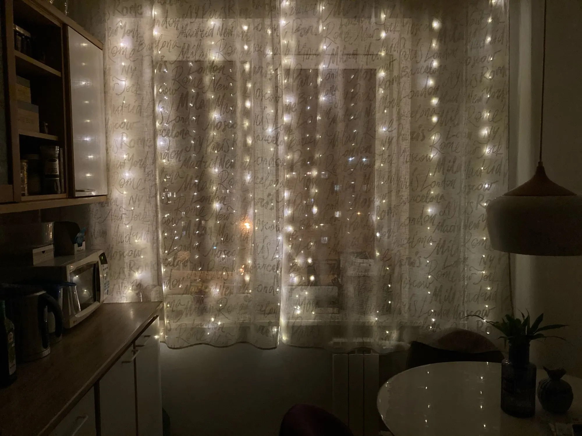 Экспресс-доставка до СПб заняла 5 дней. Посылка пришла в постомат магазина Пятёрочка. Качество отличное. В комплекте идёт пульт ДУ (необходимо докупить батарейку CR2025). Имеется 8 режимов подсветки от мигания до непрерывного свечения, настройка яркости, таймер и кнопки вкл/выкл. Расстояние между диодами по вертикали - 10 см, по горизонтали между нитями гирлянды - 20 см. При покупке опасалась, что расстояние в 20 см - это много, гирлянда будет смотреться «лысо», придётся докупать вторую. Но за счёт отражения в окне опасения не оправдались, она и так смотрится эффектно. Через пару дней кошка откусила сантиметров 20 провода диодной части, но гирлянда не перестала работать.