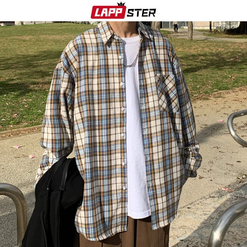 LAPPSTER мужского Harajuku плед Vintage рубашка 2020 Люди Японской Карманы Уличных рубашек с длинным рукавом Мужских Повседневная Кнопки рубашки