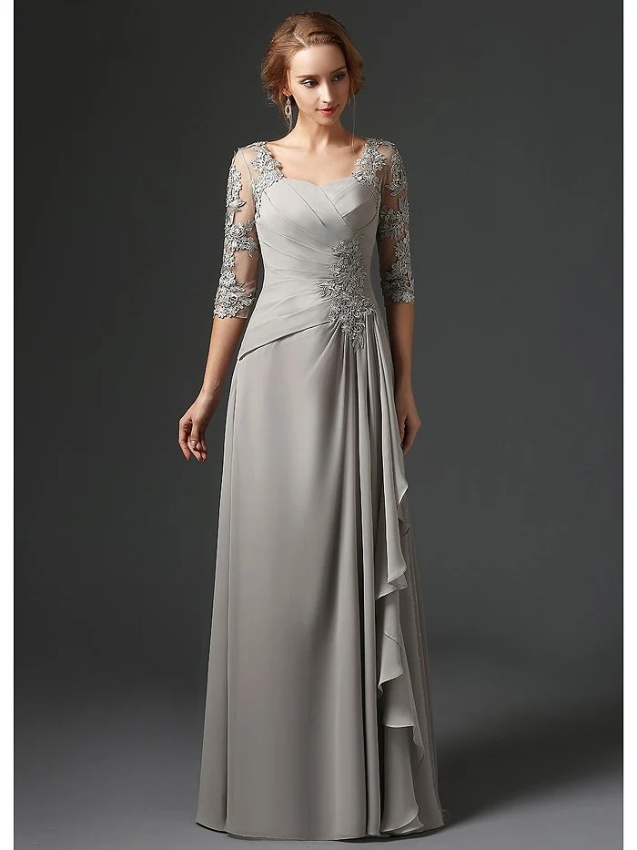 Серебряные новые летние платья для мамы невесты платье A до силуэт 34 рукава шифоновое платье с кружевами и жемчугом размера плюс элегантные платья для мамы для свадьбы