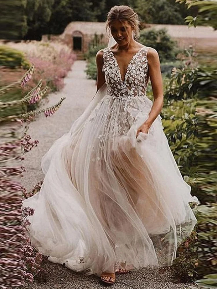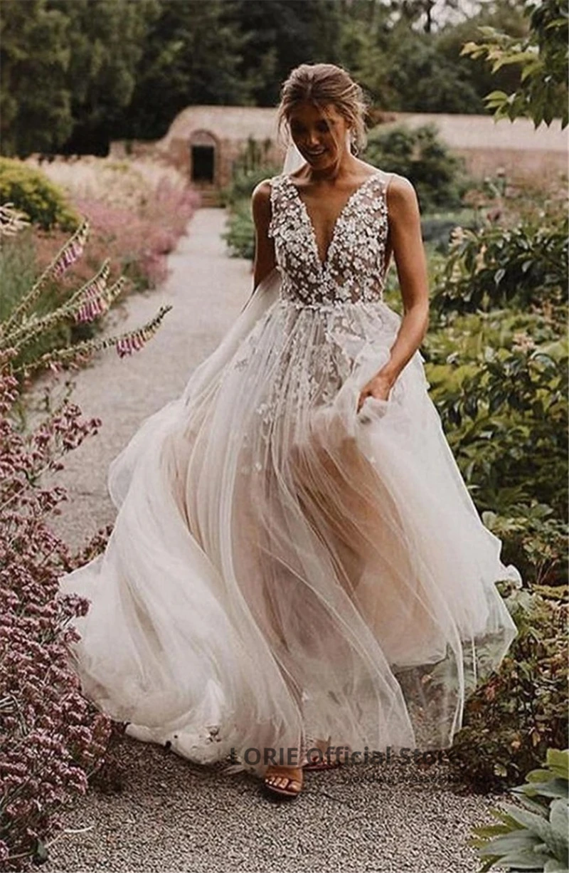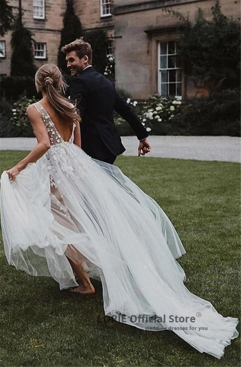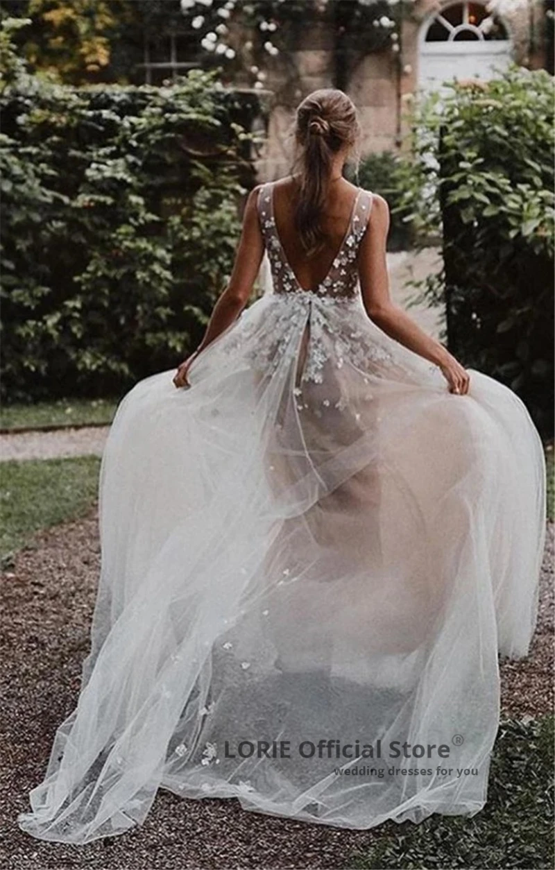 LORIE 2020 тюлевые Свадебные платья Бохо ТРАПЕЦИЕВИДНОЕ свадебное платье с V-образным вырезом без рукавов пляжные свадебные платья с 3D аппликацией вечернее платье принцессы