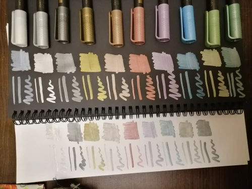 Отличные маркеры! Все свежие, все пишут, цвета красивые! Очень довольна. Единственное пожелание к продавцу - лучше упаковывать, в пути разбилась и помялась коробочка, брала на подарок и вид уже не совсем праздничный))) но это мелочи.