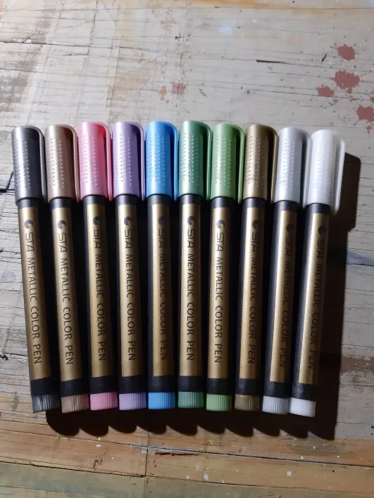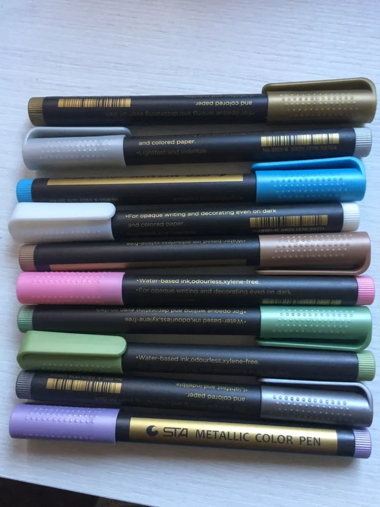 классные фломастеры. рисуют и на камне и по дереву. очень ярко смотрятся. посылку ждала около месяца в Латвию. ничего не помялось. очень довольна заказом.