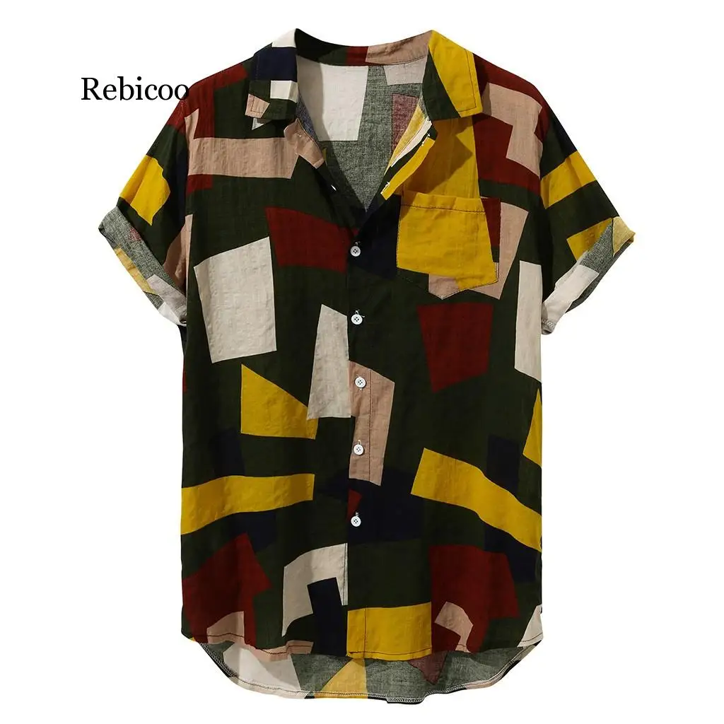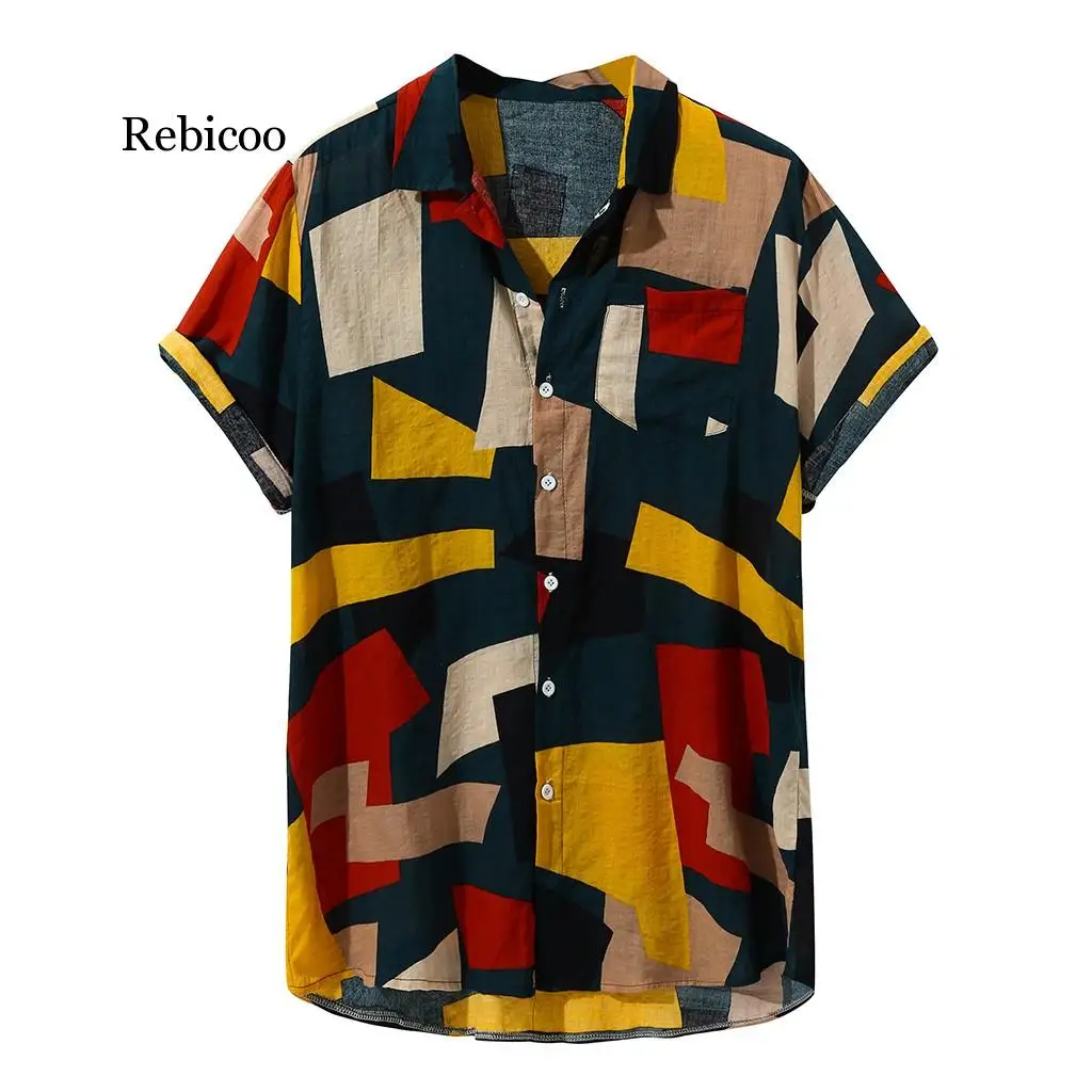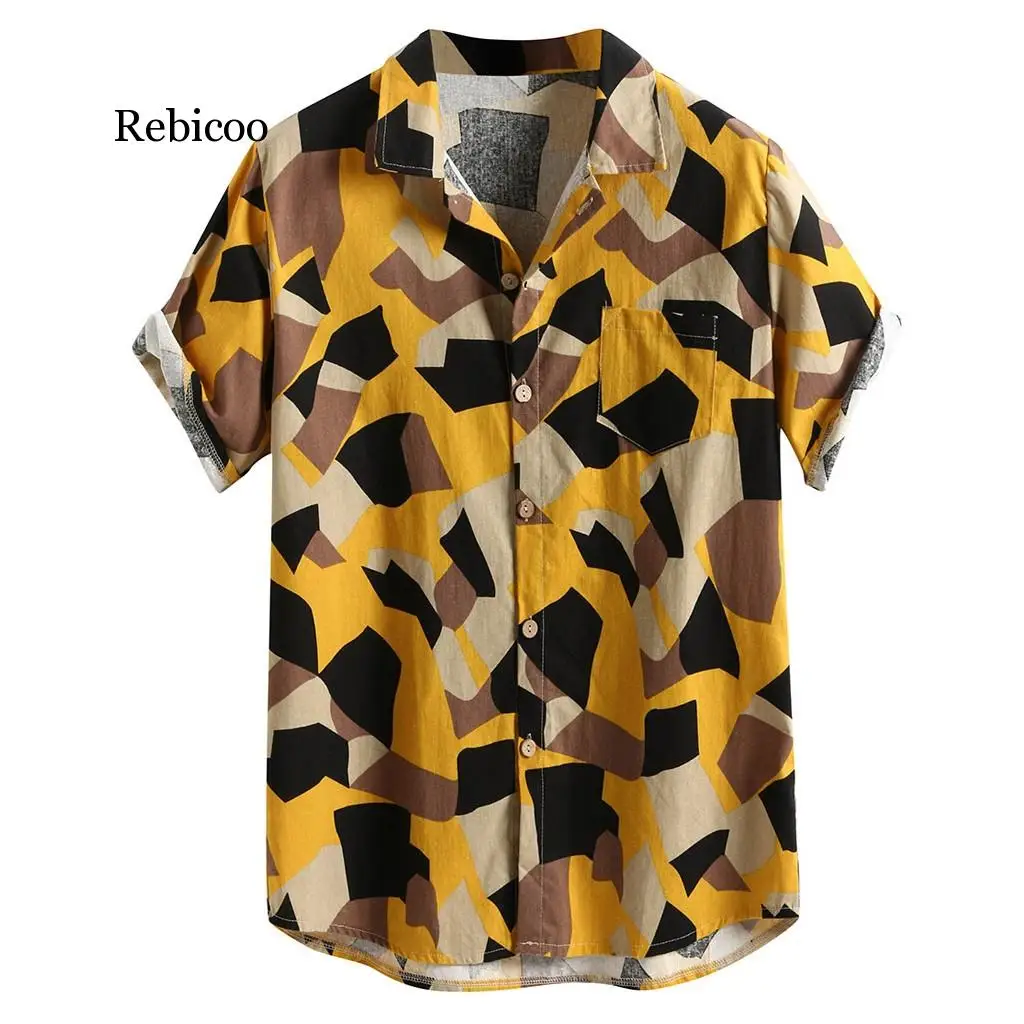 Новинка 2020, стильная мужская Свободная рубашка с винтажным этническим принтом, отложным воротником и коротким рукавом