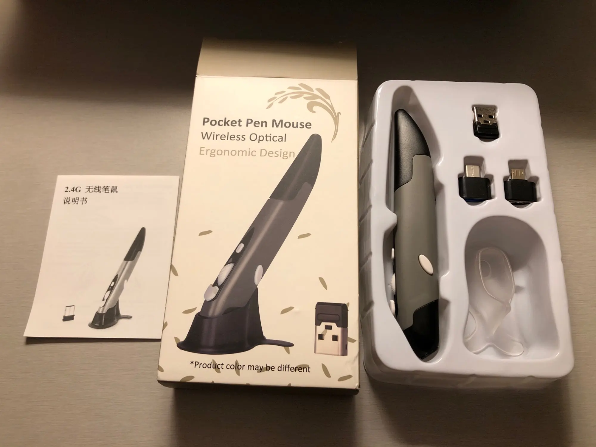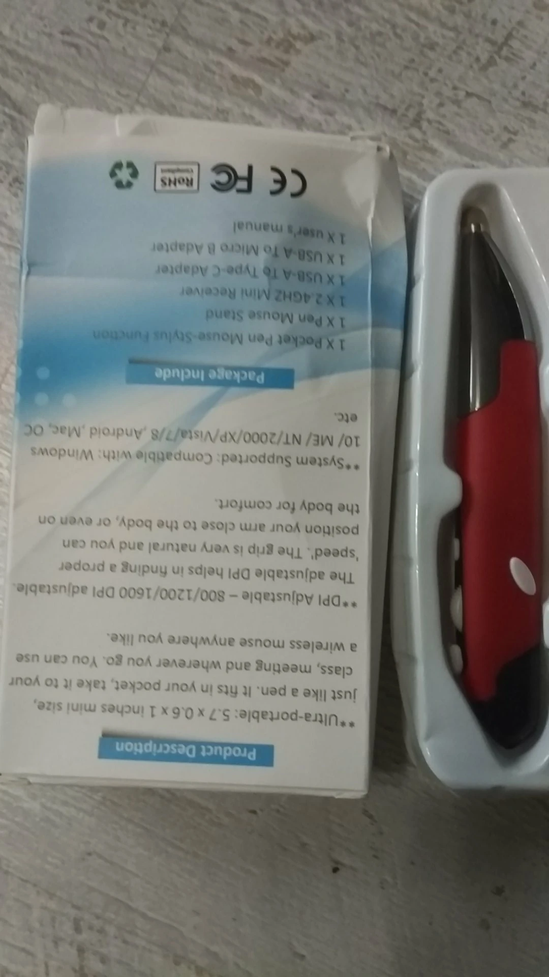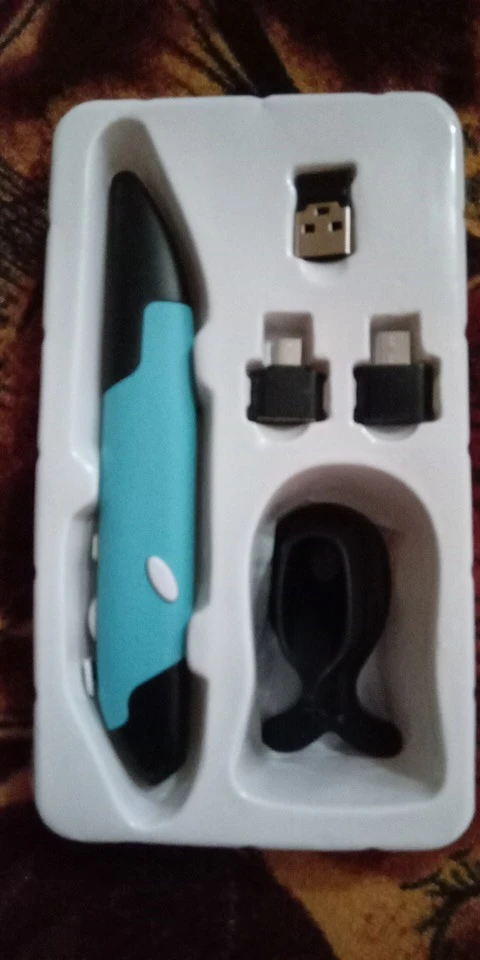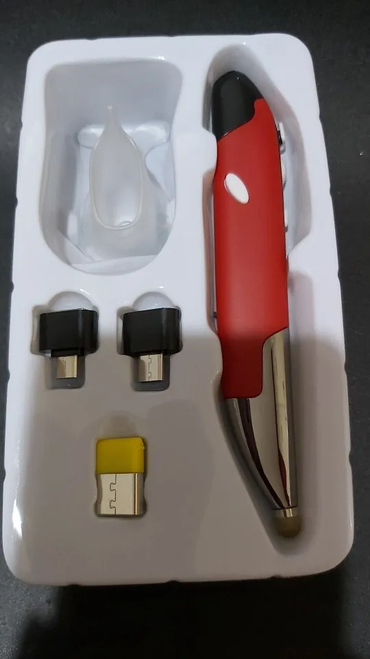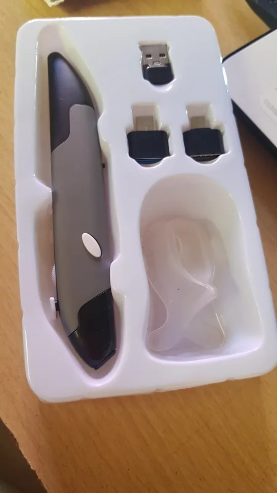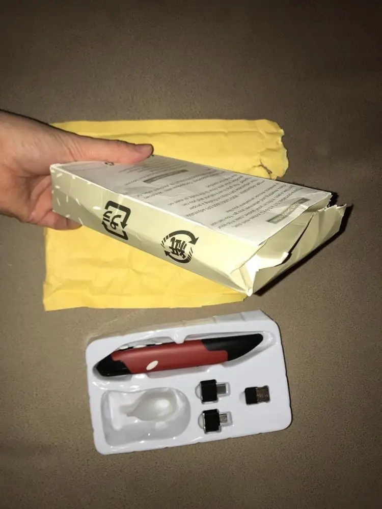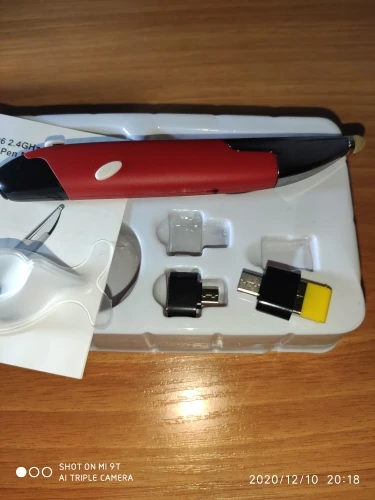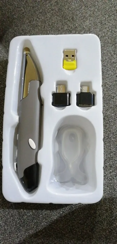 Продавец отправил быстро, но наша таможня после растаможки полмесяца продержала, пока не поругался через техподдержку посты РФ. Мышь-карандаш супер, выглядит солидно, в руке удобно, очень удобно, 2 переходника микро и тайп С и сам микро приёмник юсб - работает на всём: и на компе, и на планшетах, и на смартфонах. Всё кнопки работают даже в Андроиде. Инструкция инглиш и Китай. Батарейку купите сами ААА.