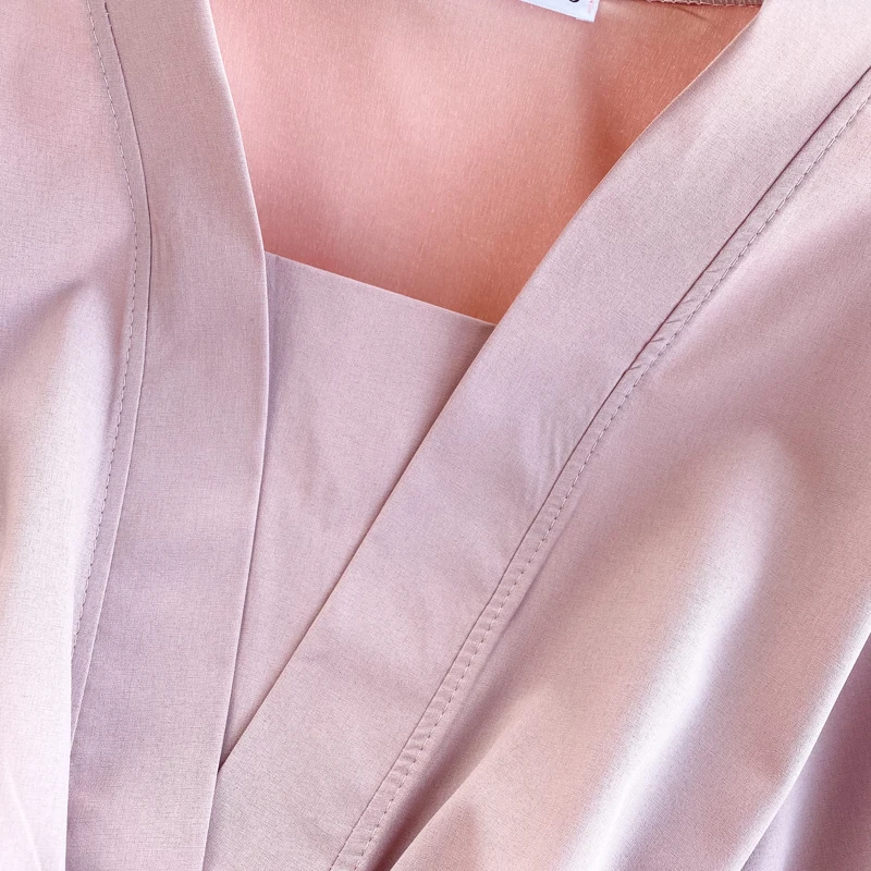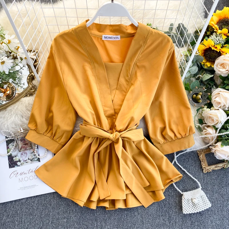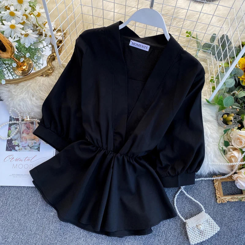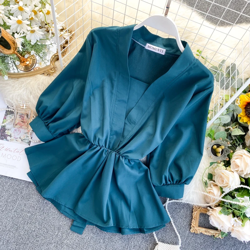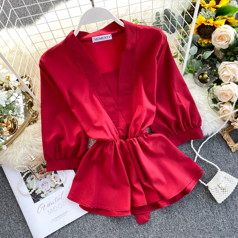 Рубашка женская на веснуосень, однотонная, с V-образным вырезом и оборками, ML673
