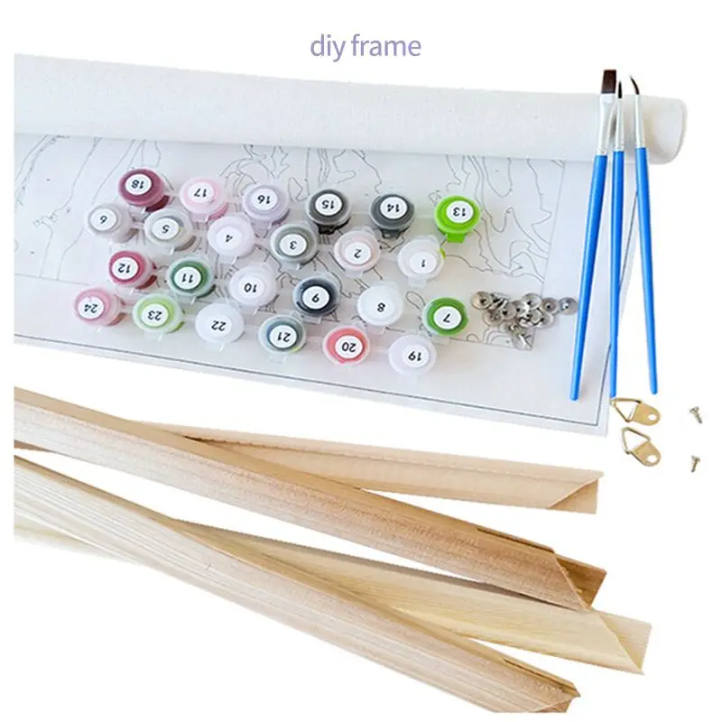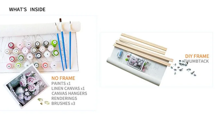 Льняной холст; 3 кисти; 1 набор акриловых красок; Инструкция; Справочный лист; Рамка; Вешалка; Винты