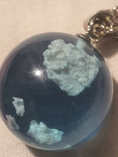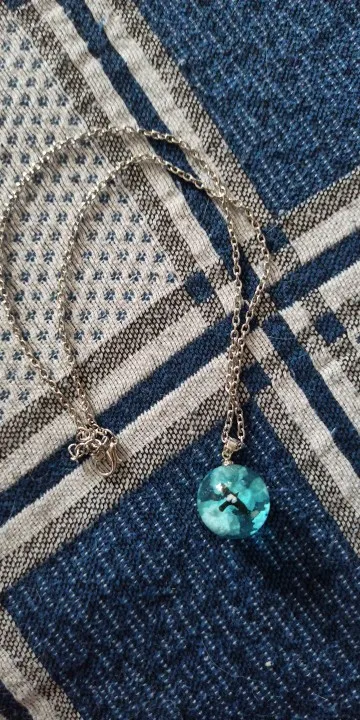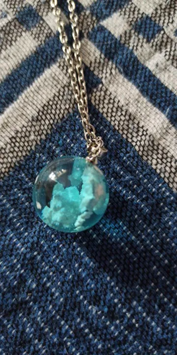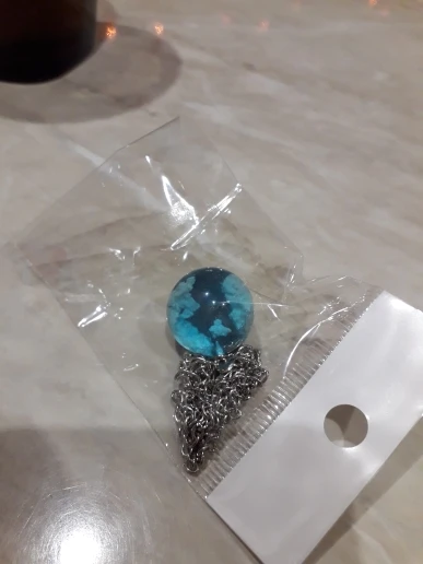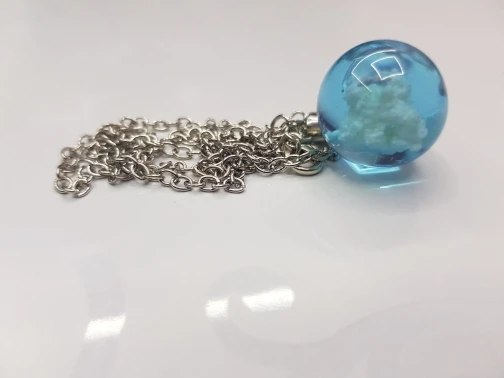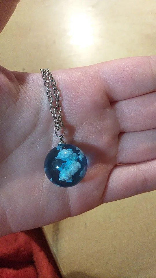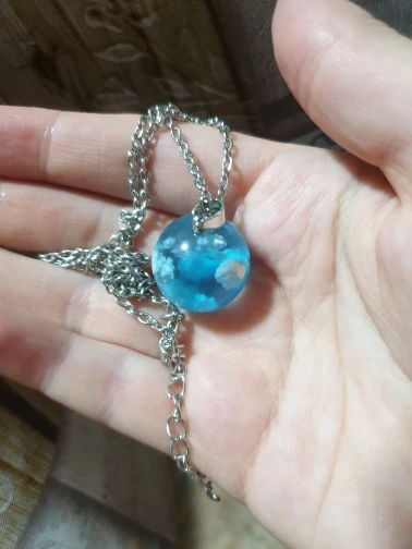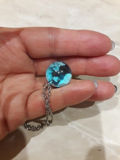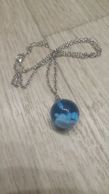 Милое ожерелье. Шар из пластика. Думаю, что он будет чувствовать себя больше как стекло, но может определенно почувствовать его пластик. Все еще приятно.