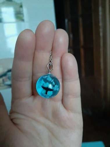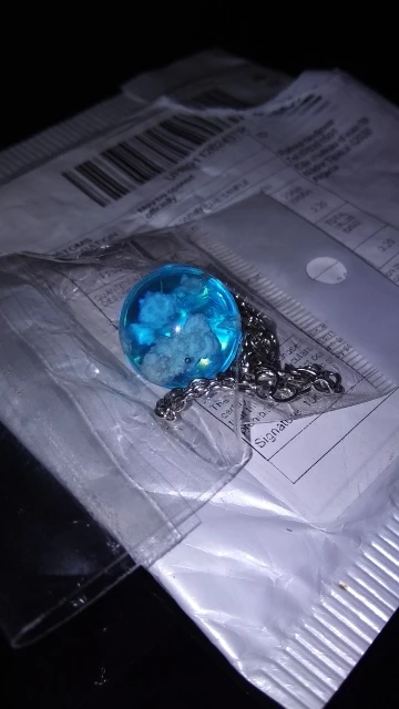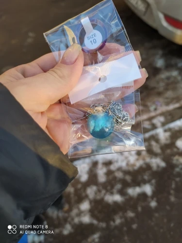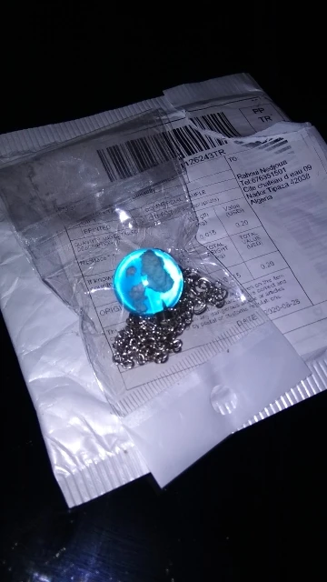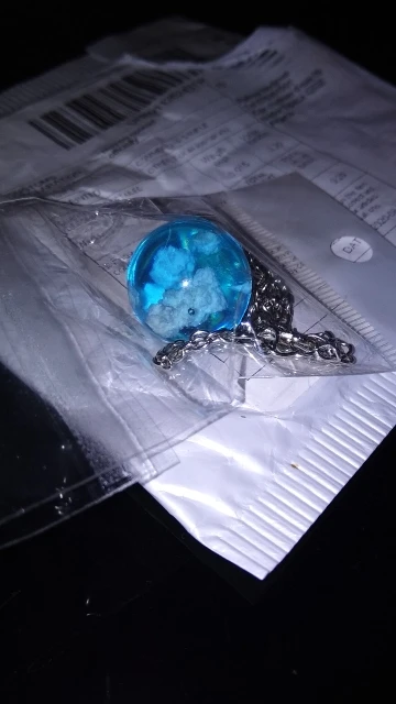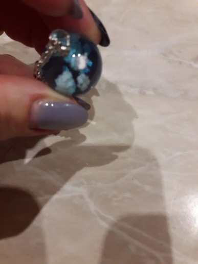 Я в ужасе... На коротенькой цепочке голубой шарик, в котором тупо кусок пенопласта... Небрежно и некрасиво. На картинке было намного красивее. Но, ставлю 4,потому что сама виновата, надо бит ыть внимательнее.... Пришло быстро. Упаковано хорошо, сколов нет