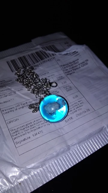 в Киев пришёл за месяц, кулон очень красивый но есть погрешности, вроде пузырька воздуха внутри и выпирающего куска пенопласта, хоть текстурно и шар идеально круглый и гладкий, но выглядит Это белое пятнышко так себе, сам шар пластиковый, хотя ожидала что будет стеклянный