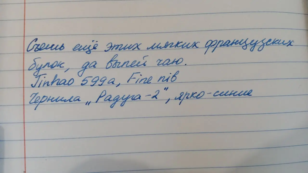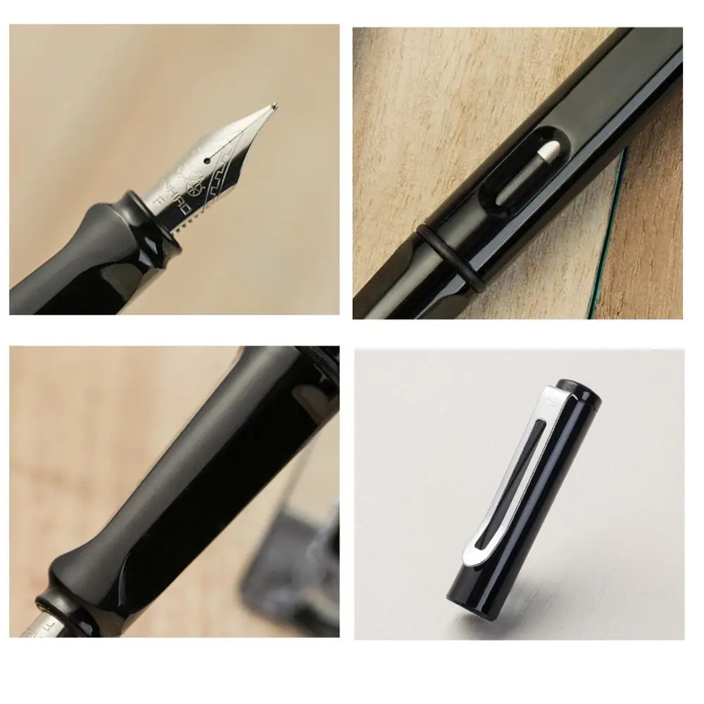 Ручка пришла с выпадающим пером и какими-то клейкими пятнами грязи. Перо отказывалось держаться в ручке. Вдобавок, кончик пера был погнут (правая половина выгнута чуть ниже левой), и оно царапало бумагу. Как будто кто-то пытался его заменить, и делал это неумело. Пришлось слегка разогнуть перо у основания, сделать более плоским, ну и чуть выровнять наконечник. Ушло примерно полчаса. После этого ручка стала писать очень хорошо и мягко. Здесь хотя бы перо оригинальное, и в целом меня результат устроил. К тому же ручка пришла в жёсткой упаковке, и с милым чёрным чехлом на завязочках! :) Но если вы не хотите возни как у меня, на AliExpress вы можете найти эту же ручку в прозрачном пластиковом наборе с картриджами. Там в комплекте два оригинальных пера (половинки ручки с уже вставленными F и EF перьями), картриджи, и вы можете быть уверены что после завода никто с этой ручкой ничего не делал.