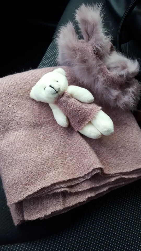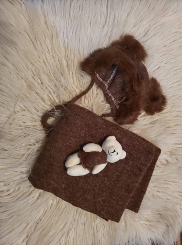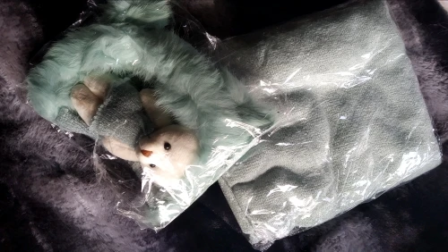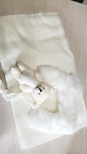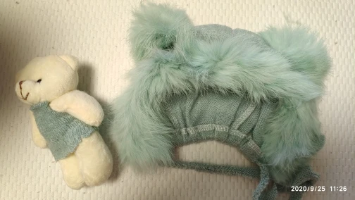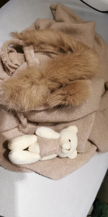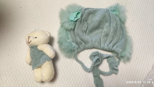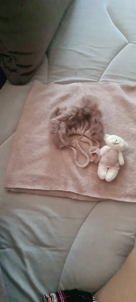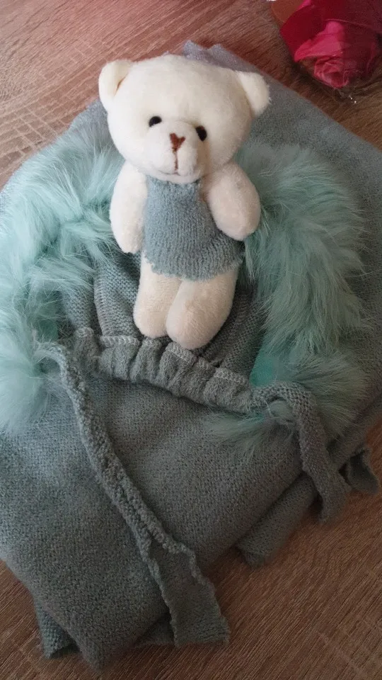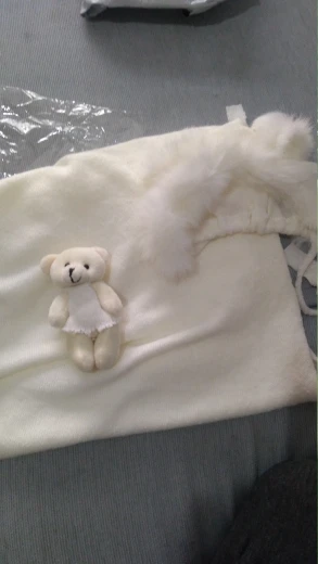 Шапка немного маленькая. Также не такой пушистый/полный, как показано на фотографиях. Одеяло и медведь также имеют страшный запах!