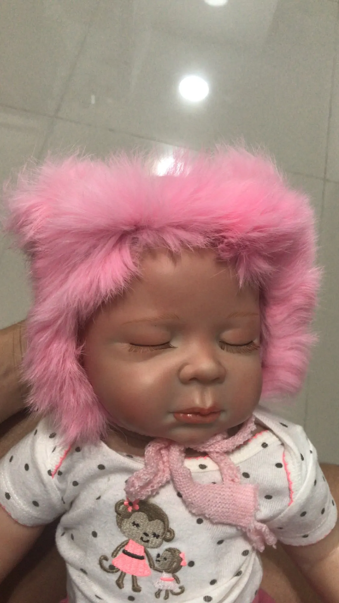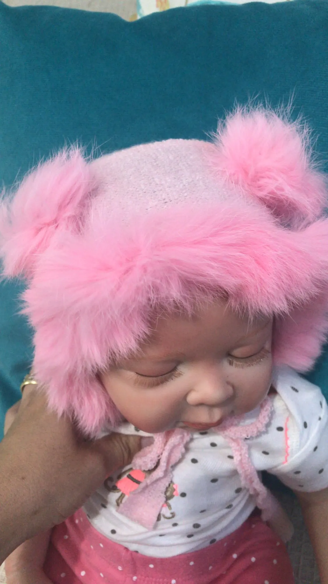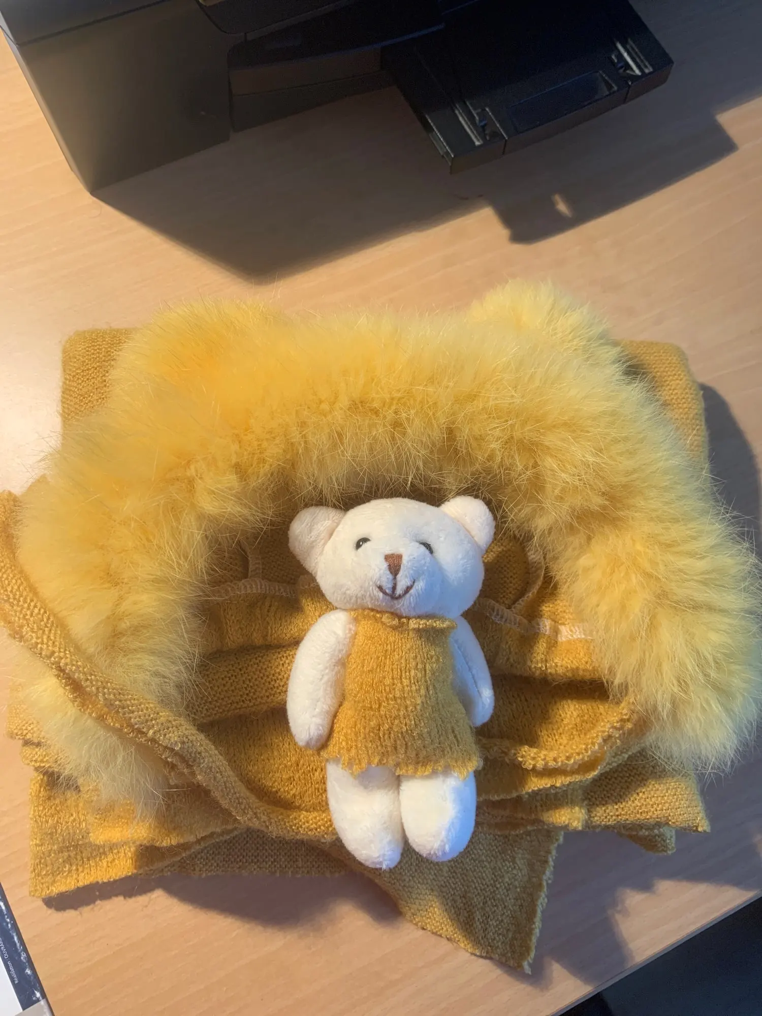 Шапка немного маленькая. Также не такой пушистый/полный, как показано на фотографиях. Одеяло и медведь также имеют страшный запах!