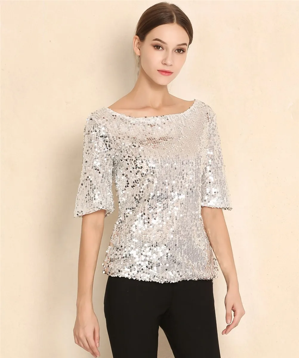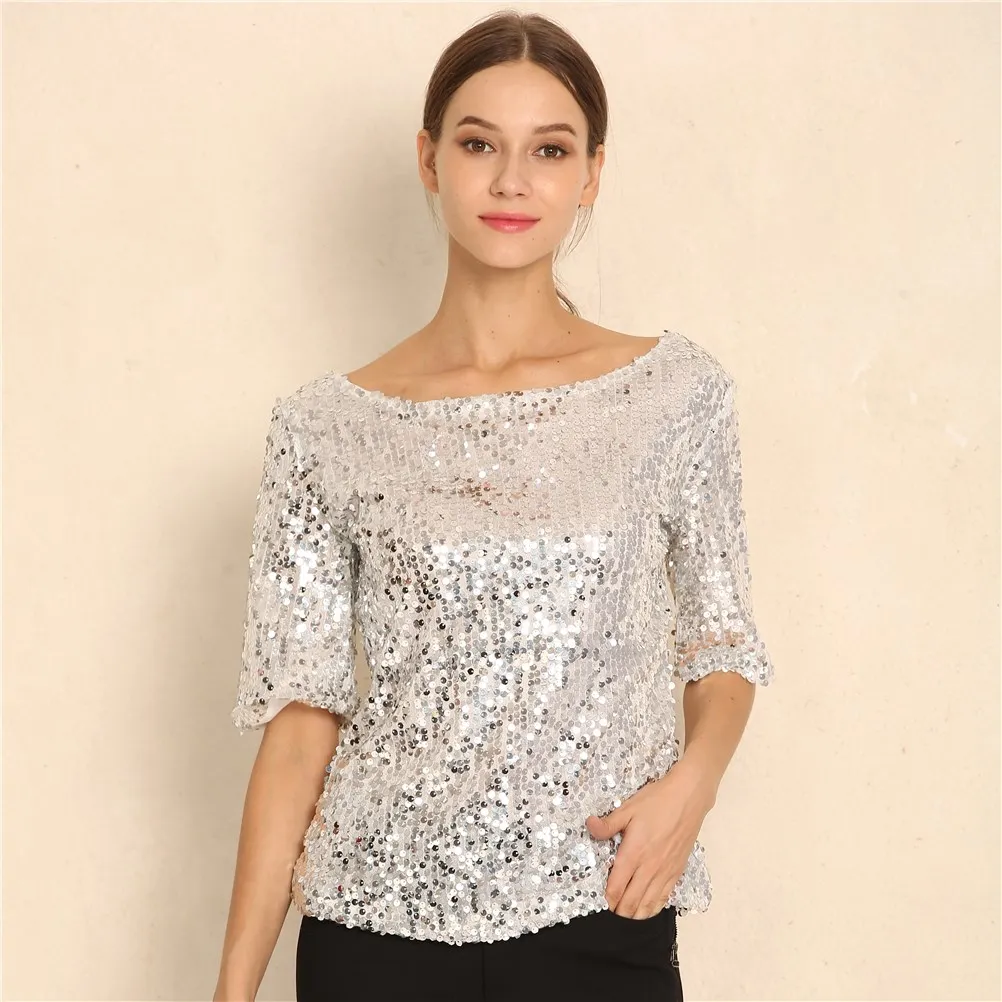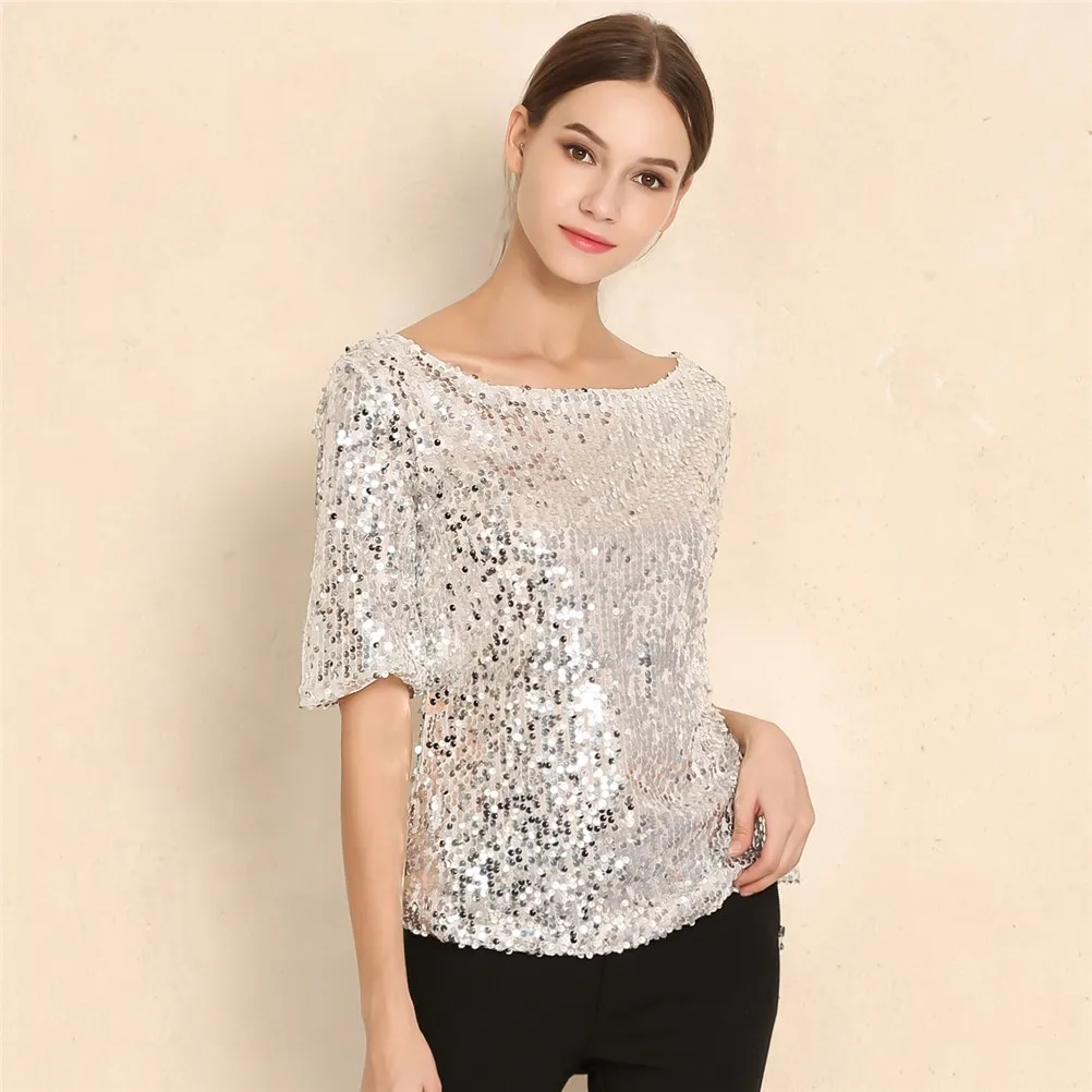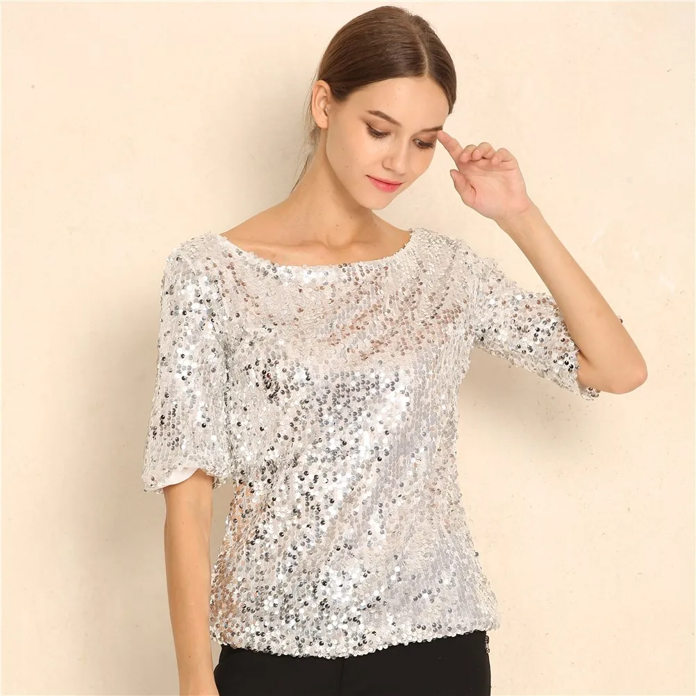 Новинка, Женские топы и блузки с блестками, вышивка, пятиконечный рукав, Свободная блузка, Повседневная рубашка, размера плюс, S-5XL