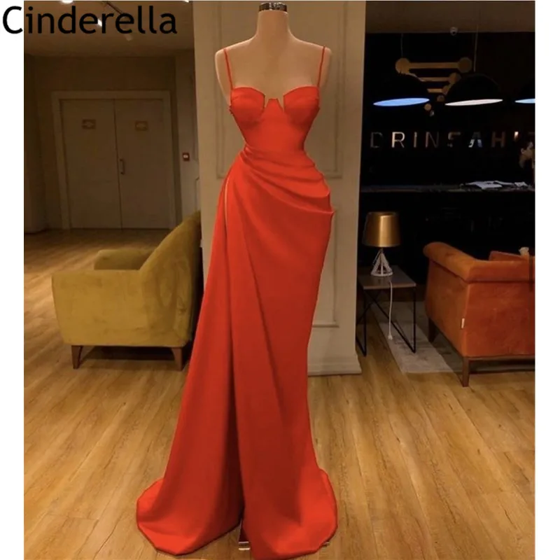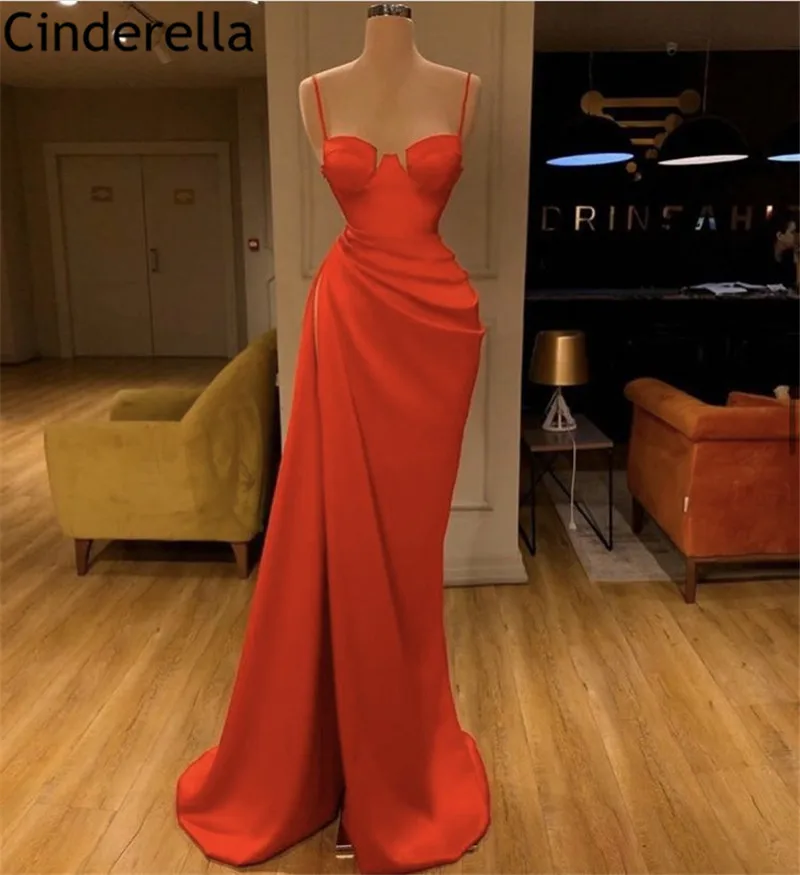 Женское атласное платье с юбкой годе, красное платье на тонких бретельках со шлейфом, для выпускного вечера